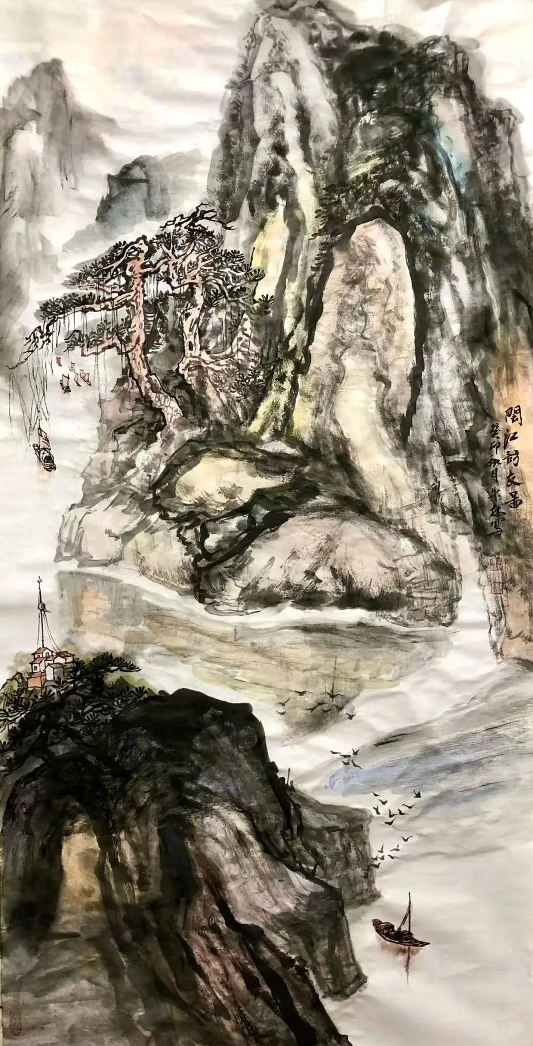 朱林先生中国山水画用笔,气韵生动,法度严谨,是靠书法用笔体现的。朱林先生用笔爽利劲键,干脆利索,八面出锋,却又婉转优雅。他无论是用宽笔,或是泼墨,能把力度藏在圆润的笔触之中,于不动声色之中把骨力显现出来。这就是绵里藏针。画面的轻盈之处恰是画面的最难处理之处。山水画之中,画云画水,如轻轻一扫,画面浮滑,若秋后枯叶,教人厌烦。若重笔挥写,则浊气满纸,若老树之皮,甚为丑陋。因此,必须拿捏的恰到好处方可入妙,此道非千锤百炼不可为之。读朱林先生的淡墨用笔,就可以看出他的感悟之深,功力之厚了。中国山水画设色到底有多难?现举例为证:清朝四王之一的王石谷说自己研究绘画四十年才会用花青,张大千说自己五十岁后才会用花青,潘天寿说,色彩和墨一遇到就打架,所以,绘画之中,用色最难。朱林先生中国山水画设色明净,典雅,冷暖结合恰当,亮丽不轻浮,丰富不花乱,在温润之中体现一种厚重之感。他的山水设色,能在众多画家不知所措的情况下,一枝独秀,极为不易,这既是他审美趣旨高雅的体现,也是他才情的勃发,是他几十年以来孜孜以求,不懈努力的必然结果。
