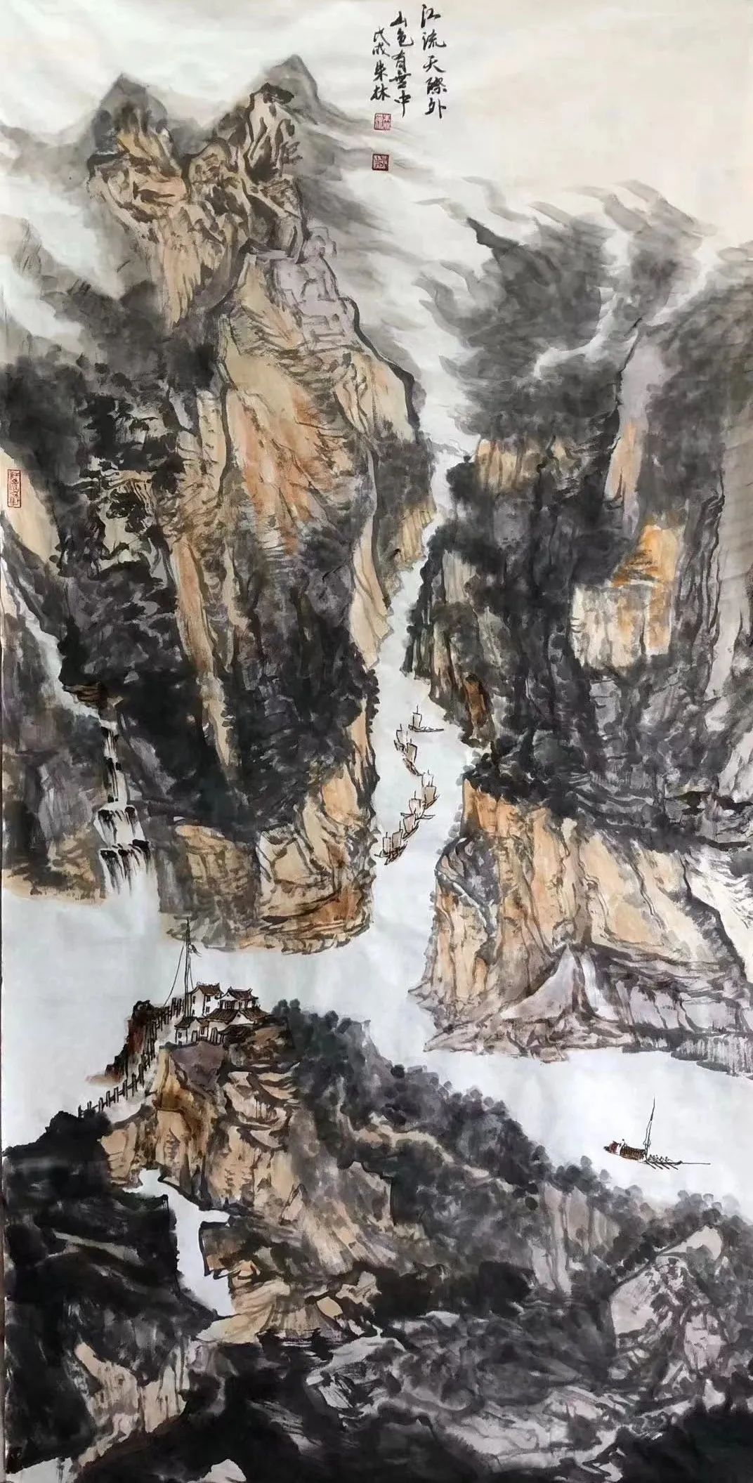 山水之气韵,是评价一幅画优劣的第一要素。凡画山水,千山万壑不难一挥而就,唯气韵难以得之。气韵,是画面物象虚实相互作用所迸发的一种视觉效果,这种效果的出现,无成法可依,无确切文字可论,全凭画家自己的学养、才情、功力、经验揣摩把握。气韵是气和韵的概念之和。在此先论朱林先生画中之气。