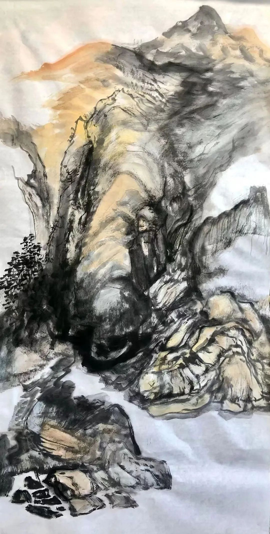 朱林先生之山水画的法度,将山水之磅礴昂扬和雄浑大气,以饱满的激情痛快淋漓地表现了出来,但是,画面造型不拘谨,不肆意。他处处审时度势,处处对比,寓厚重于明雅之中,寓豪迈于严谨之中,寓雄浑苍茫于率意之中,寓充实于洗练之中,法度严谨,而又处处随机应变。他作画从大处布局,从小处精心刻画。他的画,整体感极强。画面虽千山万水,但却整饬有机,有一气呵成之象,一处不可少,一处不可多。整个画面,初看为一象,细看为万象,再看仍复合为一象。但是,在这包孕万象的画面中,不论大块面,抑或是那些细微之处,他都能见机措象,随意生发,使其充满活力与情趣。大的山石,在不失气势的情况下,使其情态各异,尽显生物之象。小的物象,细致精到的表现,用心刻画。看他画中的小树,虽寥寥几笔,却是一丝不苟,有情态,有动态,像孩子,像牛马,这便是他小处精当,随机应变的表现。
