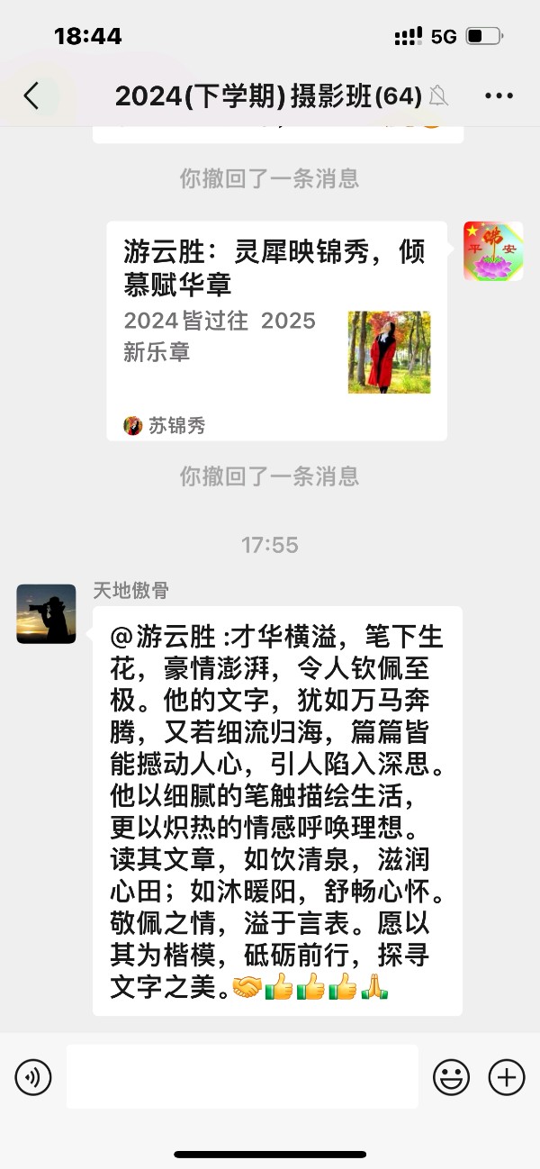 遥想初叩文字大门时,我青涩稚嫩得如同春日里刚冒头的新芽,在未知的迷雾中瑟瑟发抖,满心都是对前路的忐忑。幸而,您带着渊博的学识与洞若观火的卓识大步走来,宛如穿透暗夜的启明星,引领我拨开层层迷雾,得以窥探知识海洋深处的璀璨明珠,领略创作苍穹之上的浩瀚绮丽。您手持镜头,捕光捉影,绘就山河的雄浑壮丽、定格市井的烟火百态;我紧握笔杆,蘸墨挥毫,书写岁月的沧海桑田、抒发心灵的幽微情愫。虽说术业有专攻,然而对艺术的炽热挚爱、对至美境界的执着叩问,让我们仿若交相辉映的日月星辰,共耀无垠苍穹。这份厚重如山、深沉似海的师恩,早已镌刻在我的灵魂深处,成为我冲破一切艰难险阻的磅礴力量源泉。