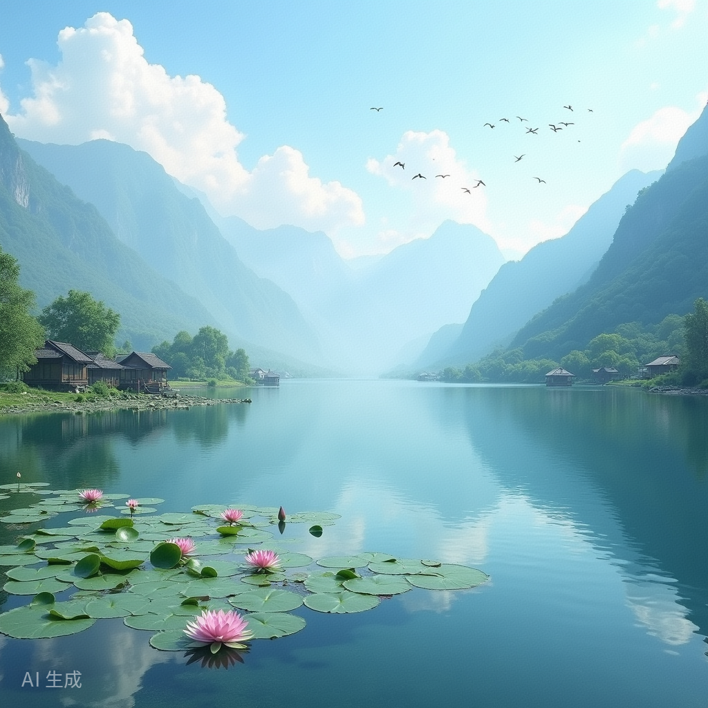 一条小船渐渐驶近,船上的卓玛姑娘嘴里唱着热爱的歌,一块云降下来,依偎在一首歌里,阳光深情,缓慢舒展。