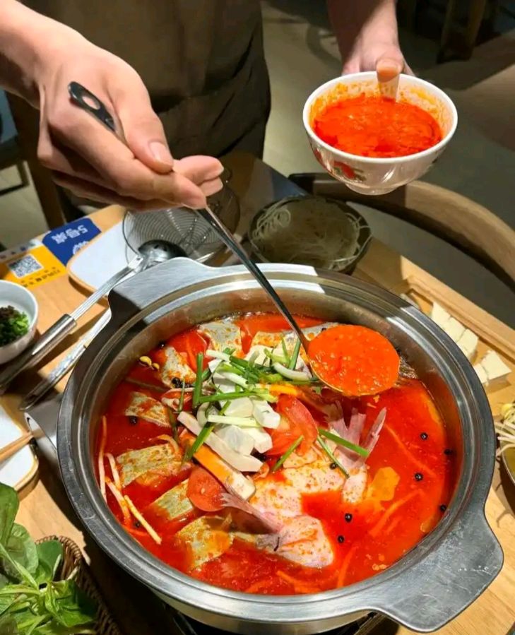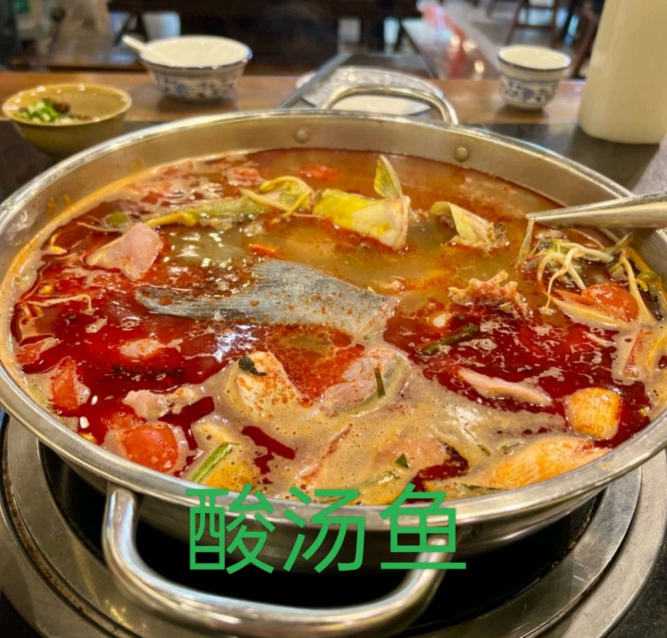 不一会儿服务员就端上来一锅酸汤鱼,和一些配菜和饮料等食品,那汤汁是鲜红色的里面有葱花和香菜等,看起来就让人垂涎欲滴。鱼肉是黄辣丁,我们每个人先盛半碗酸汤在自己的碗里,漫漫喝汤漫漫品味。哇塞!酸汤的味道独特又浓郁,那股酸味浓厚而不刺激,那辣味则增添了食欲传遍自己的味蕾,越喝越有味。汤汁里融合了蕃茄的酸甜味与木姜子的特殊香气,再加上各种香料的配备,每喝一口都令人沉醉。