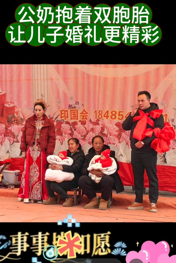 看着两个小家伙可爱又喜人,由公奶抱着慢慢出现在婚礼台上现身,现场上掌声响个不停,双胞胎如同两颗闪亮的小星星,给家庭增添了乐趣且无穷无尽,看着两个小家伙翻身、坐立和爬行,喜气盈庭。有了双胞胎后家人之间的关系也更加亲密。婚礼也因为双胞胎现身让大家惊喜,让整个场景增添了浓郁的气氛。