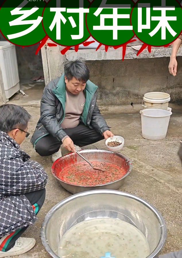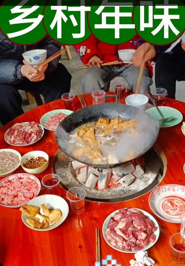 随着一个电话打过去,亲戚朋友聚一聚,帮忙杀年猪忙忙碌碌不停息:有的在用柴火烧水,有的把肥猪拉出圈去;有的在煮饭洗菜作好吃饭喝酒的准备……不一会儿大家八九个坐上宴席,该吃泡汤的就随意,该喝8+1的就把酒壶提一提,干脆来一个不醉不归。