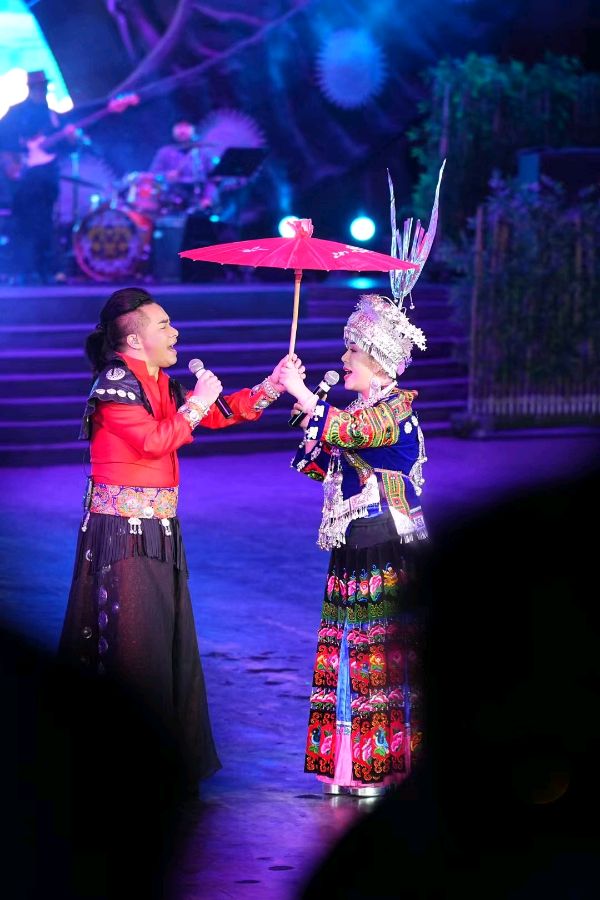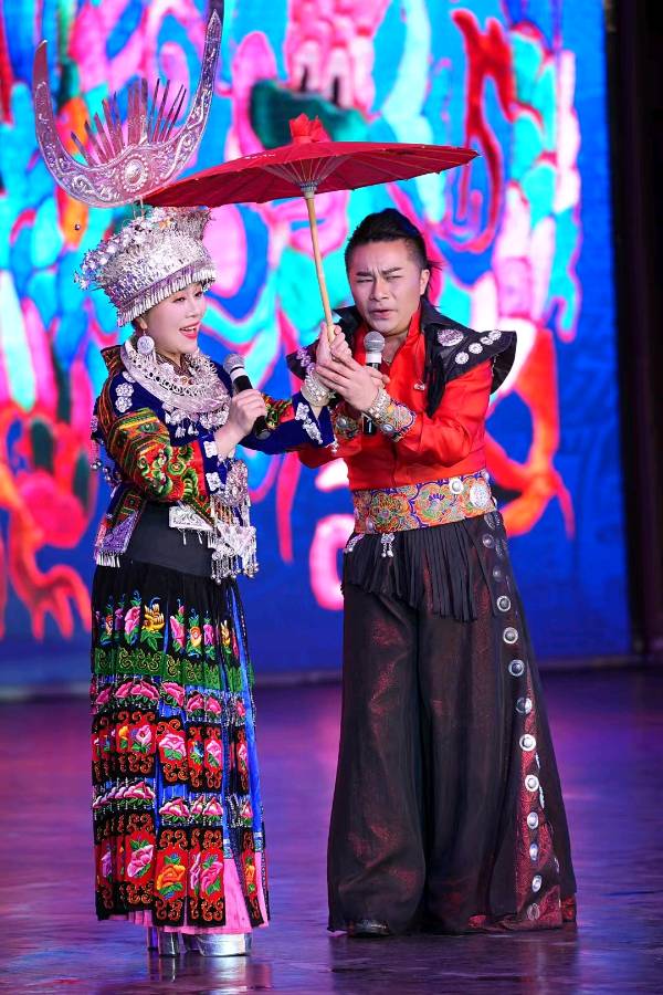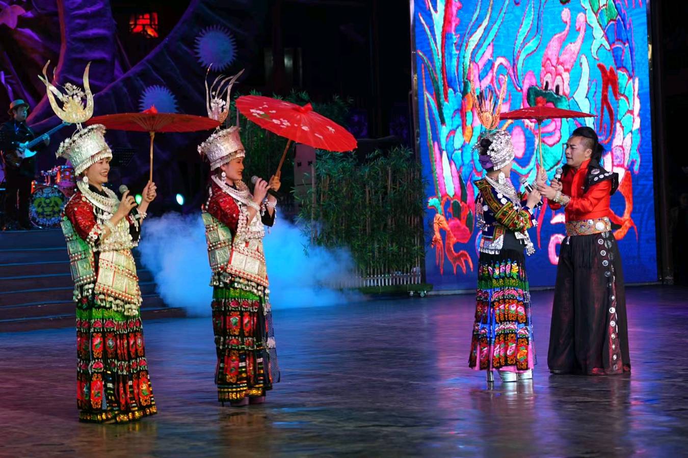 在初三晚的演出中,蝶当久和他的音乐团队延续了高水准的发挥。苗族飞歌环节,歌手用激昂的曲调将苗族人民的热情好客展现得淋漓尽致,现场观众也被这热烈的氛围感染,不少人跟着节奏一起哼唱。而到了苗族情歌部分,婉转的旋律如潺潺溪流,流淌在每个人的心间,诉说着苗家儿女的浪漫故事。