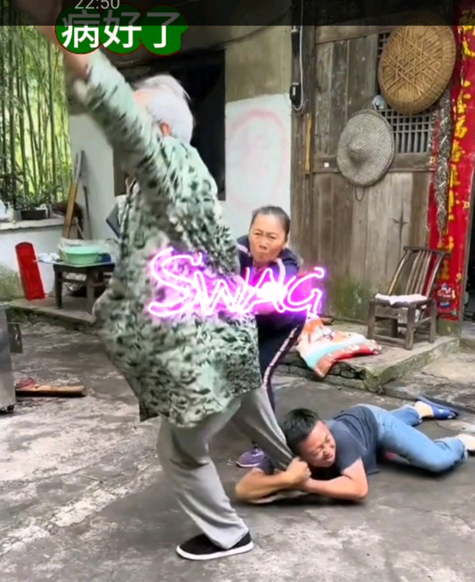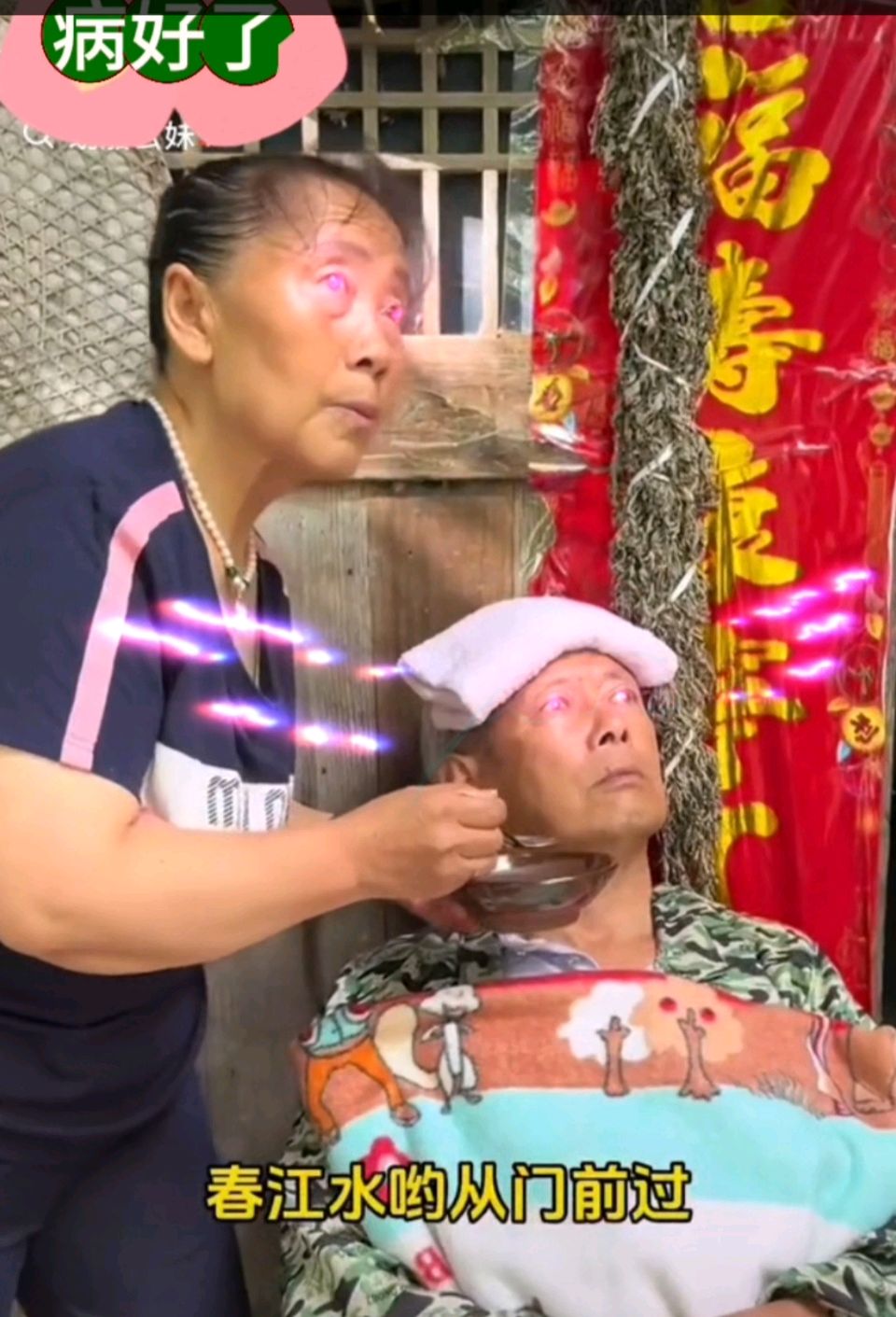 在一个农家庭院里,有一个重病男人,正在高烧不退,闭着眼睛没有精神。旁边站着一个老女人,手上端着什么东西,准备去给重病男人服务和安慰。快吃药吧!我的老夫君。快喝一口水吧!让我们家人才放心。