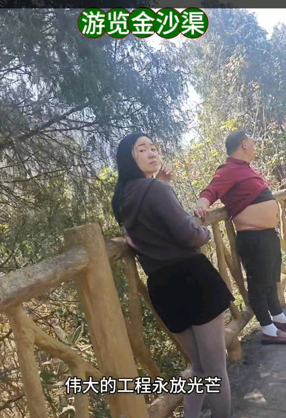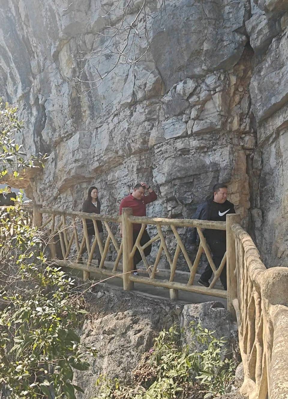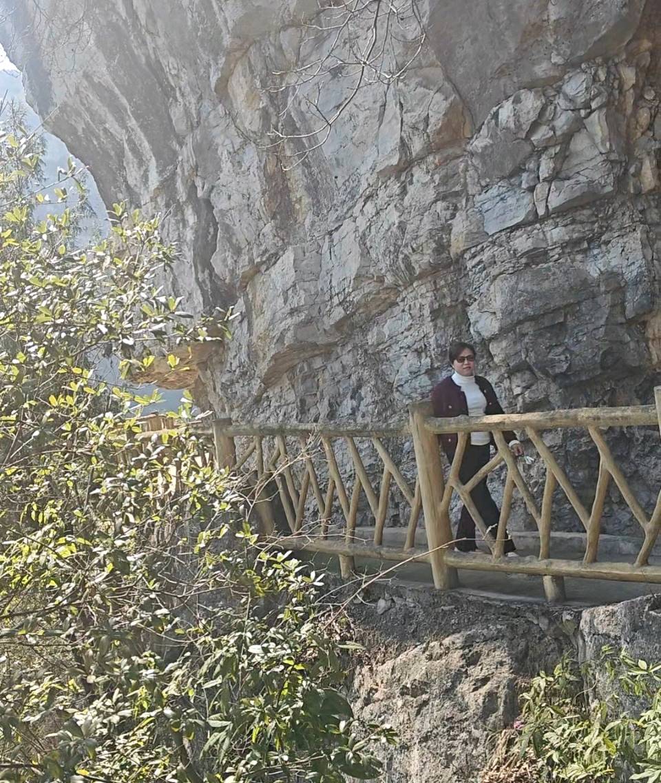 大舅爷的女儿女婿当免费的向导走在前边,带着我们沿着渠道缓缓前进边走边看,并提示我们要注意安全。此时此刻,仿佛穿越回到了那个激情燃烧的岁月。大舅爷女儿女婿边走边解说得十分透切,我才知道当年修建这条生命渠的建设者的形象又重现:无数的劳动者们不畏艰险,在悬崖峭壁上日夜奋战,凿石开山,用简陋的工具和坚定的信念感动后来者,硬是在崇山峻岭之间在后山镇开凿出了这条48公里的人工天河让人称赞。当年他们风餐露宿无私奉献,有的建设者甚至付出一切,让生命终止于悬崖峭壁下面,谱写了可歌可泣的壮美诗篇。这种自力更生艰苦创业,团结协作无私奉献的精神让人敬佩称赞。