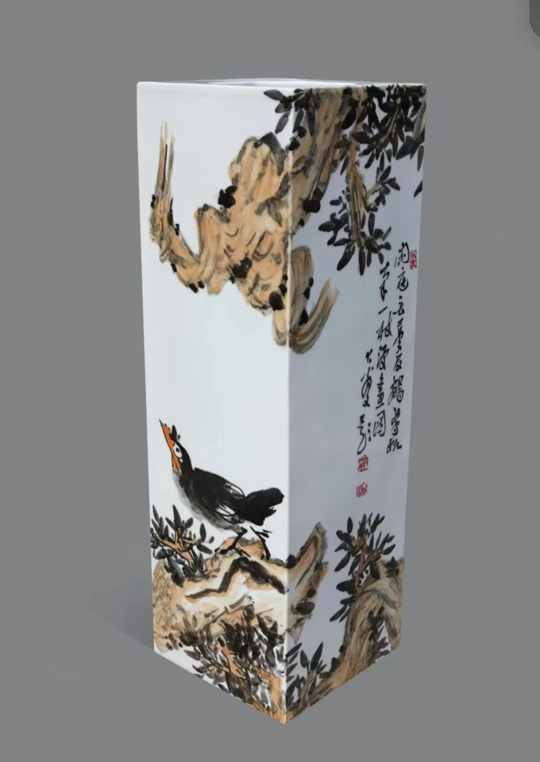 - **陶瓷绘画创新**:他在青花瓷烧制中突破技术难题,例如为达到1380℃的笔墨色烧制温度,耗费六年时间实验,最终使瓷画《八哥图》兼具水墨韵味与陶瓷质感。