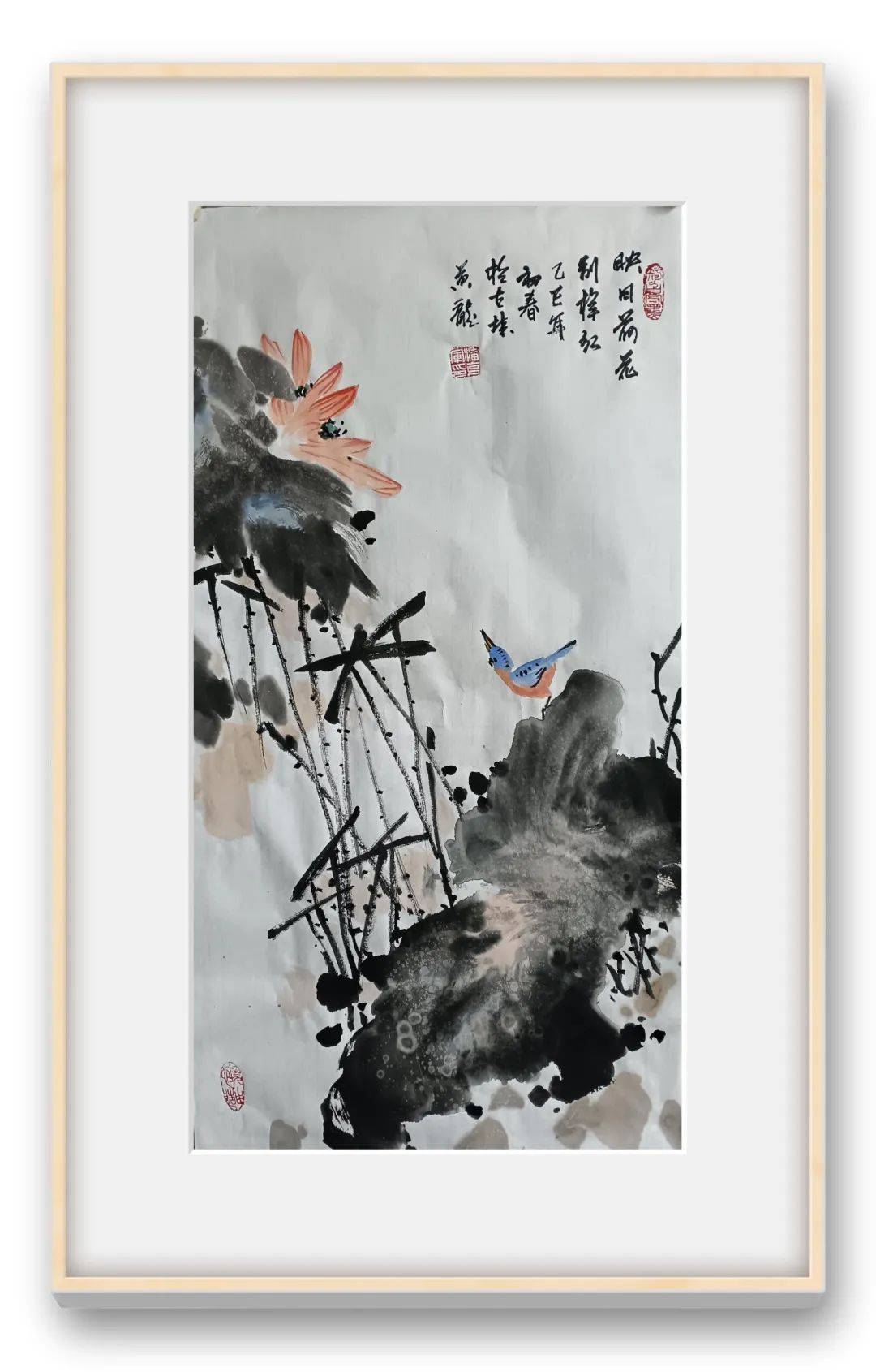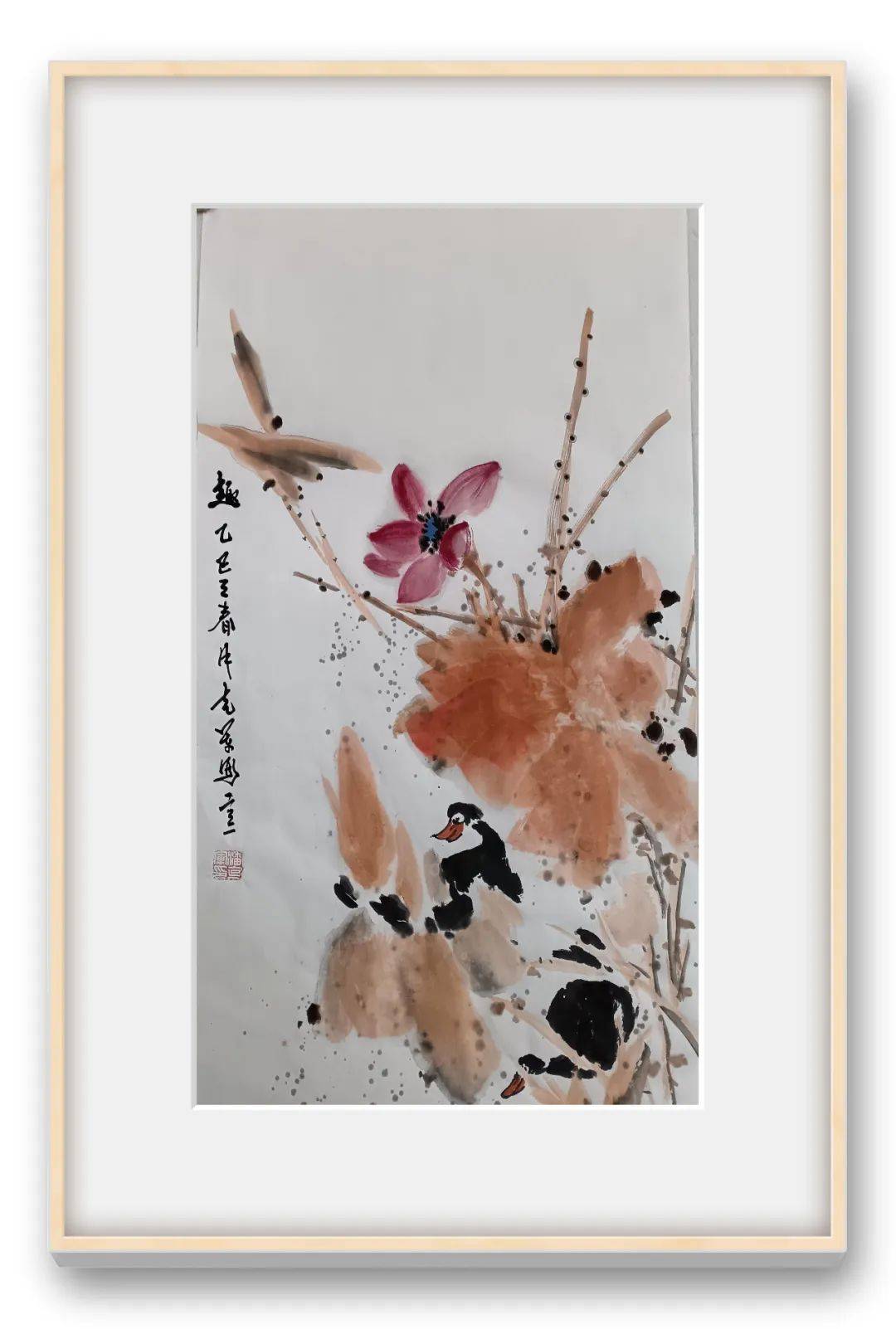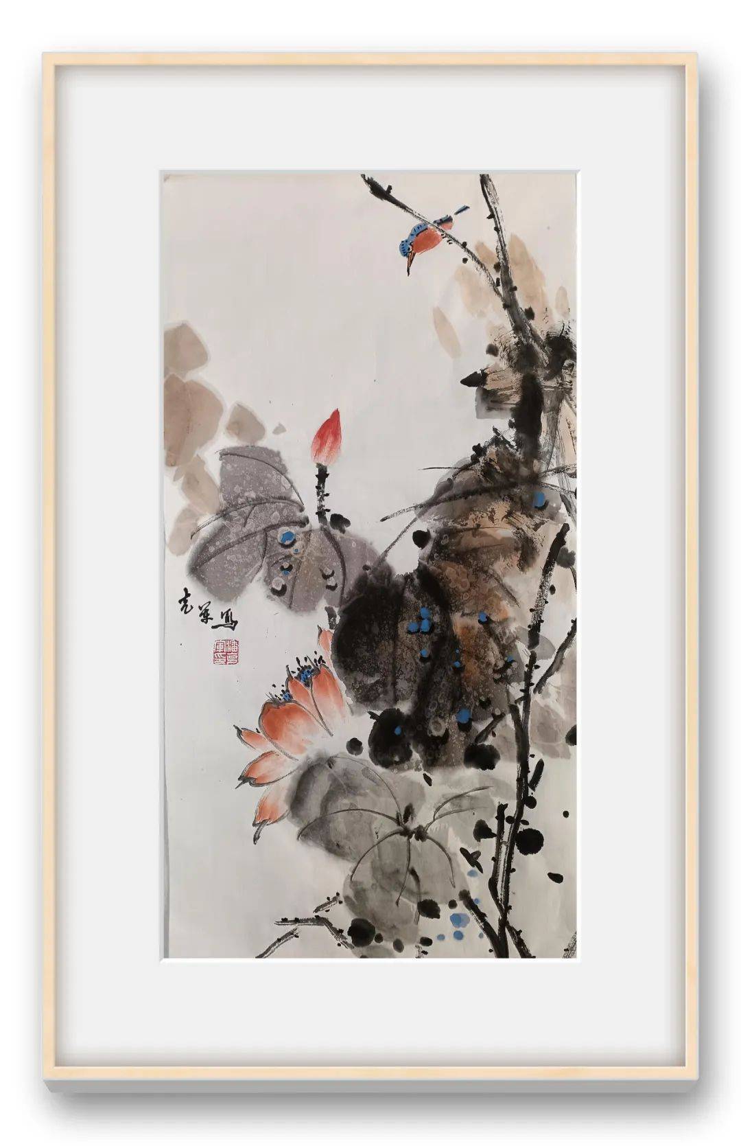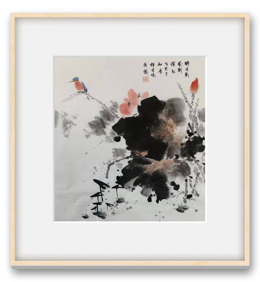 潘克军先生画中笔墨挥毫淋漓尽致,浓墨浸染茎叶,淡墨分映层次,荷花亭亭玉立于画中,时而含苞待放,时而吐露芬芳,对比墨叶更是艳而不媚,丽而不俗,两者之间可谓相得映彰。写意气象干净洗练,荷花风姿妙趣横生,品赏之余,诚是可令人深感到一股“出污泥而不染,濯清涟而不妖”的诗情内涵,致雅之作,沁人心神!花鸟寄风情,空灵蕴妙逸。