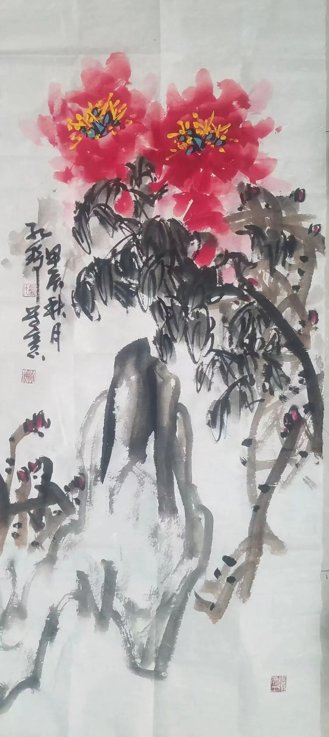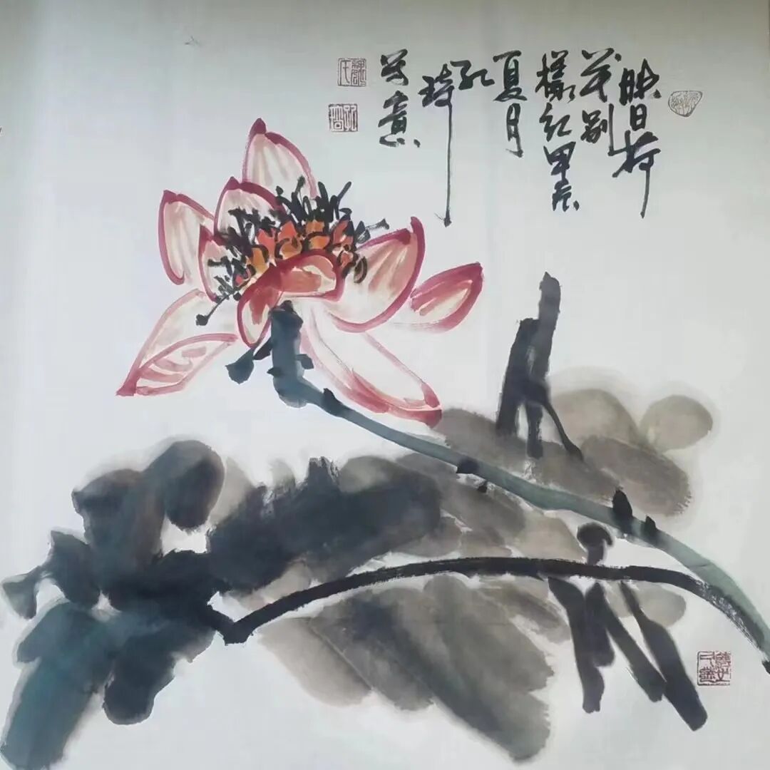 牡丹者,雍容华贵也。今魏孔琦先生写意牡丹,亦是有谙于其形神之妙。笔墨少于勾勒而多晕染,旨在于水墨中彰显淋漓逸气,更在着色中绘染高雅格调。没骨画法,含蓄传神,以至通幅牡丹取象,全在心得浑化,饶有文人画韵味!在画面构思上,魏孔琦先生更是深知切忌铺排的写意要义,故每绘一幅,画面皆是不在华滋而在雅健,不在精细而在清逸,小幅则怡情,大幅则豪放。其中枝叶纵横,花相掩映,密处不嫌满,疏处不嫌稀,由此气脉贯穿间,自是一派天然图画也!谛观良久,纸上生情,写意舒朗,情景合一!