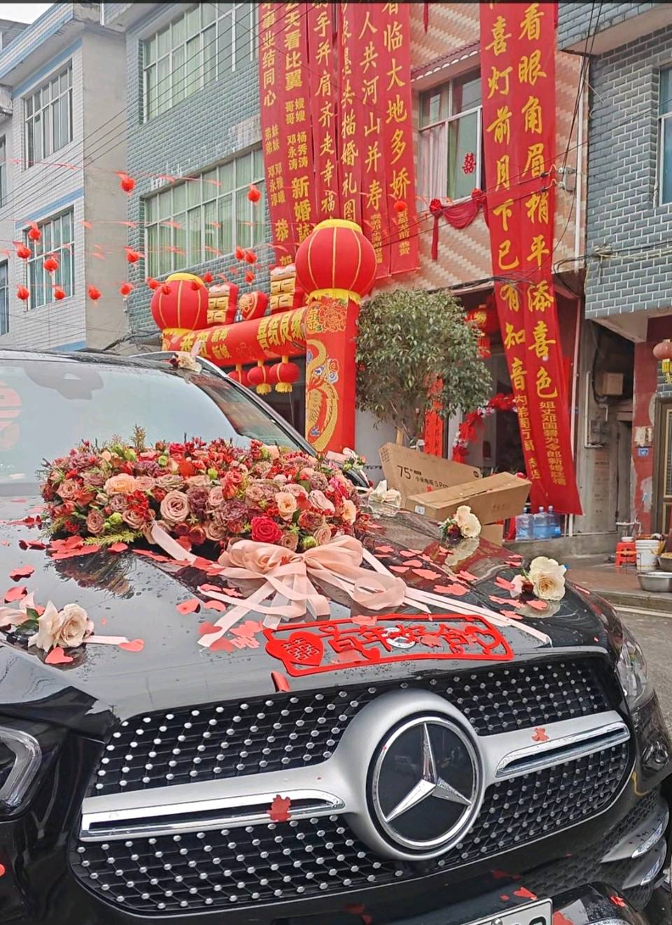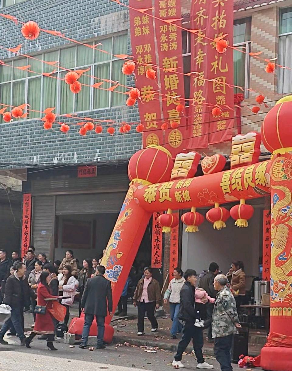 第二天早晨,接亲的男方家把新娘接走了,因为女方家与男方家是同一个村里的距离不远,不一会儿就到男方家了。哇塞哇塞!男方家大门上方挂满了祝福的布标,显得非常喜庆,增添了婚礼的气氛。