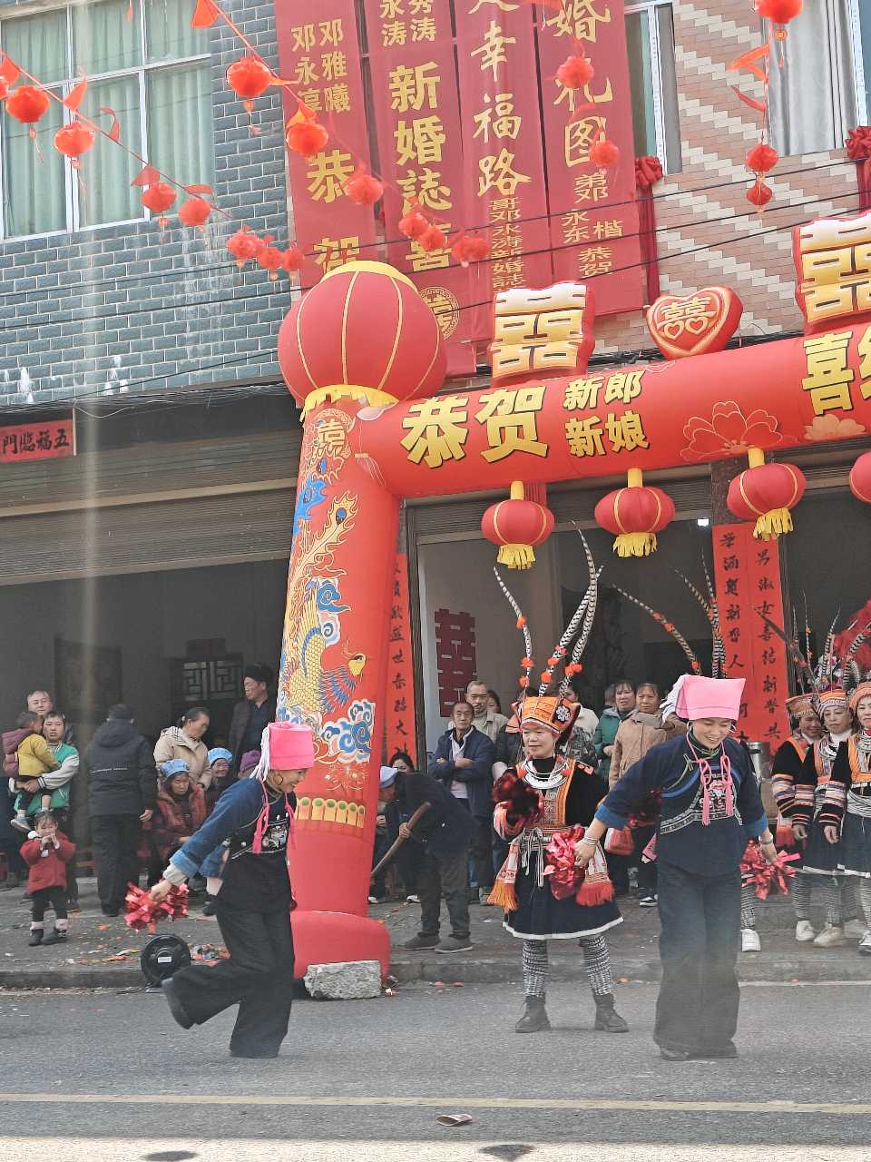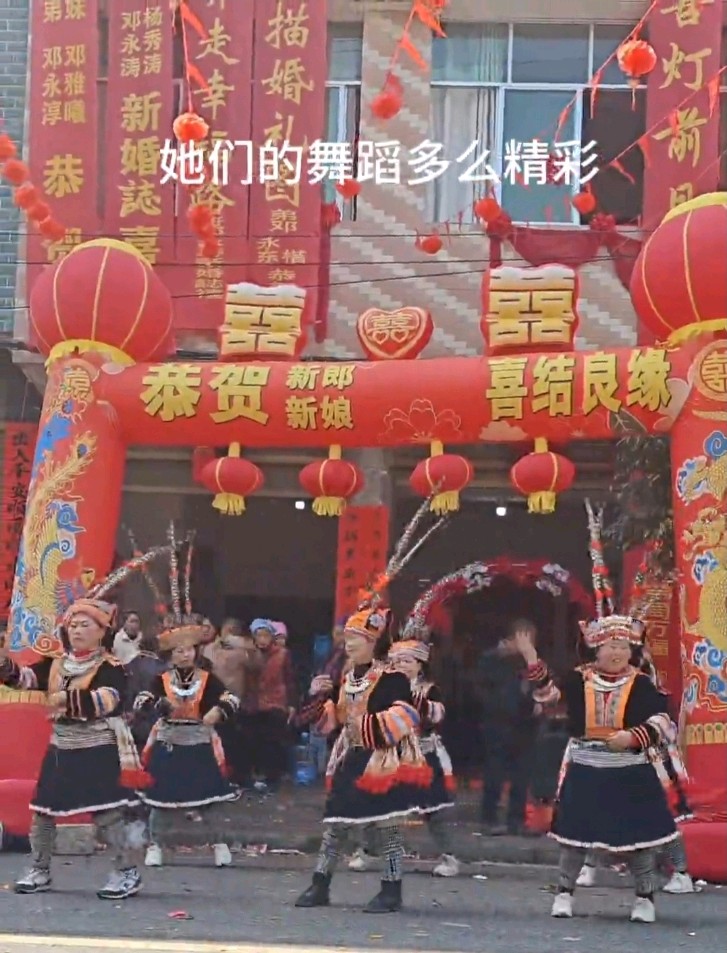 当新郎新娘快到男方家时,鞭炮声响起来了。下了轿车,新郎就背着新娘高高兴兴进了大门。一拜天地,二拜高堂。夫妻之间对拜,送入洞房。随后,安排进入宴席。十个八个不论,吃好就行。接下来,观看歌舞表演,大家边吃边看,可开心极了。