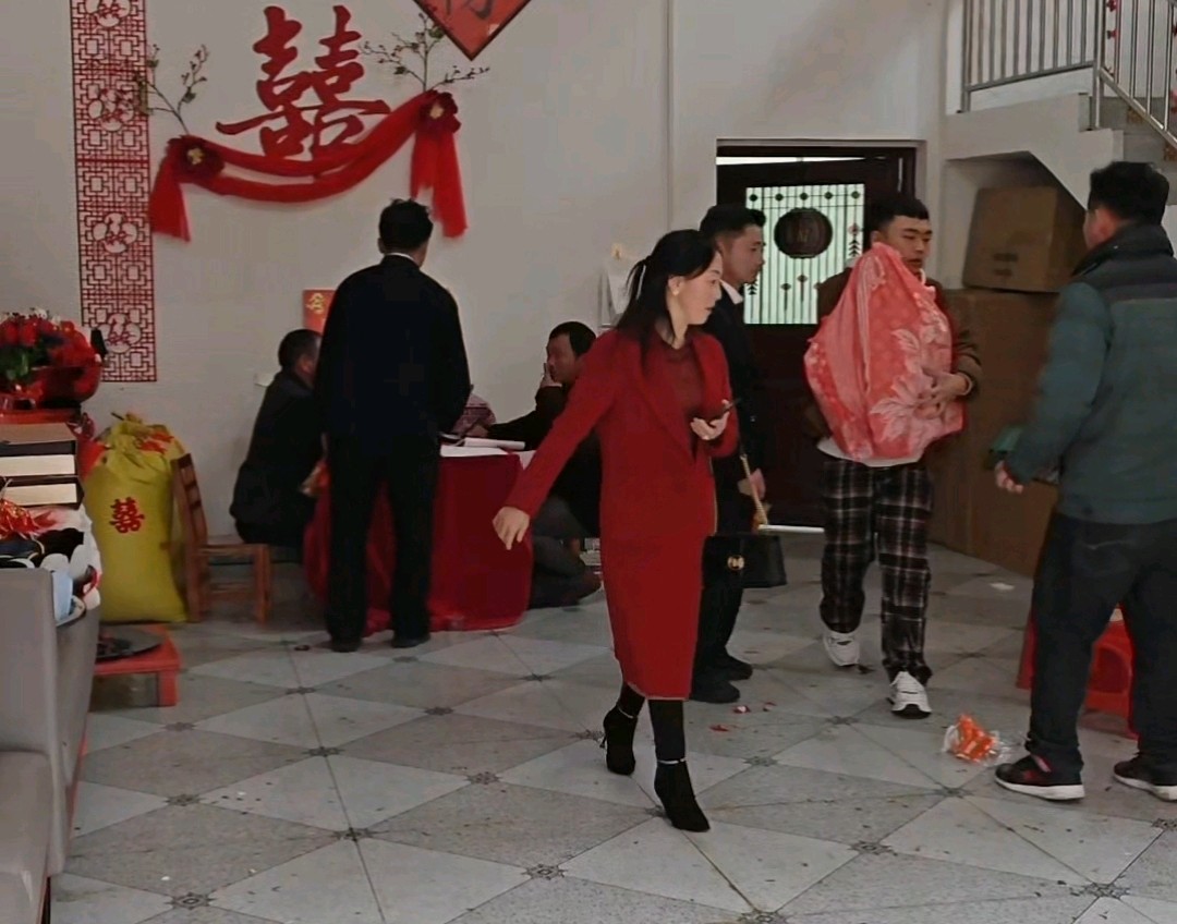 此时此刻,侄女家门口前面摆有桌子,桌子上放有酒杯,酒杯里装有啤酒。桌子后面有一根长长的竹子两端有人拿着,原来是女方家要求男方家要先喝“栏门酒”,才准进入女方家里,男方家有的喝了,就可以进家了,有些人喝不了,又只好用“妙招”了,有人马上把小红包丢出去,让大家去抢红包,趁机进入女方家里了。