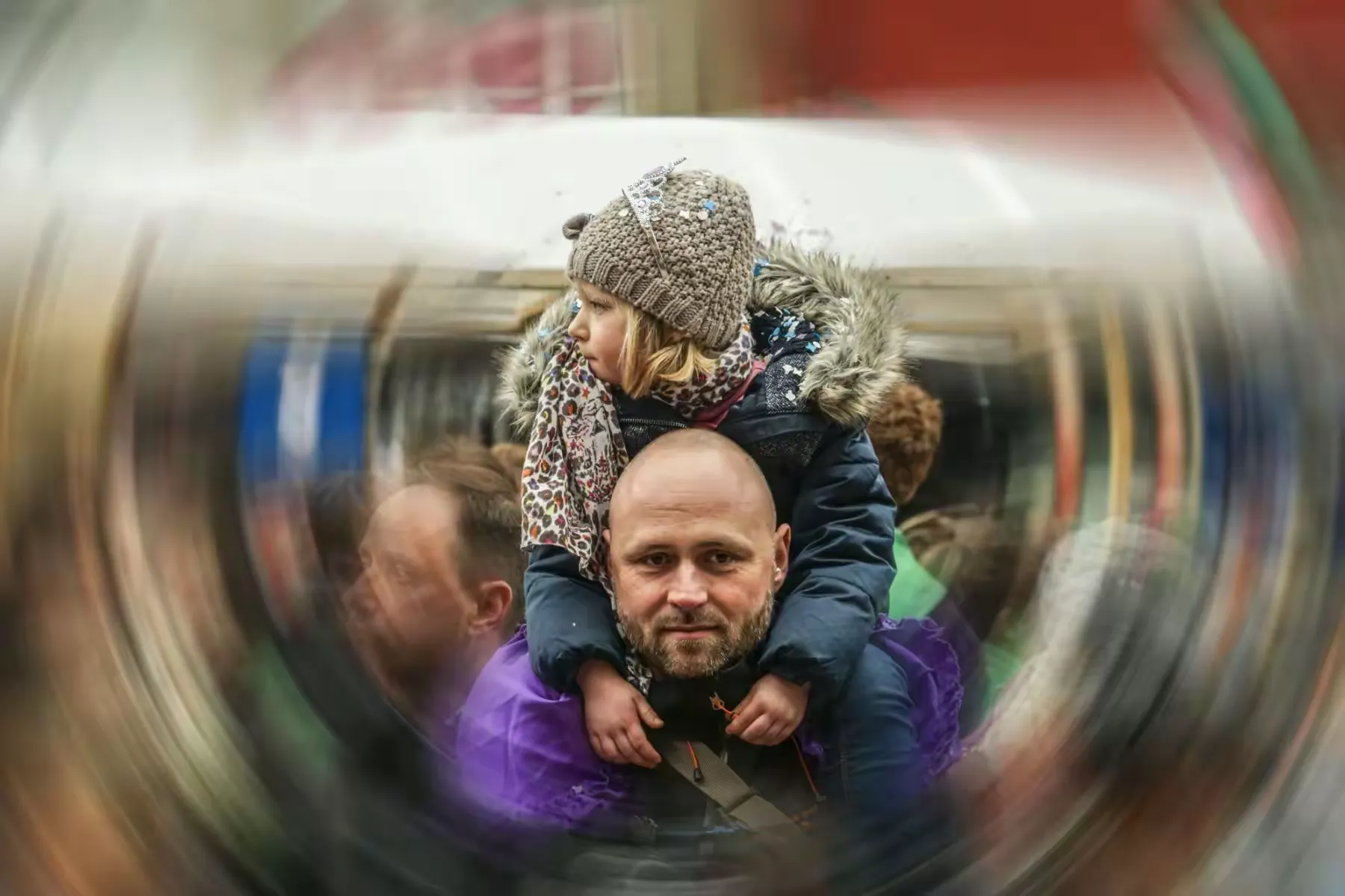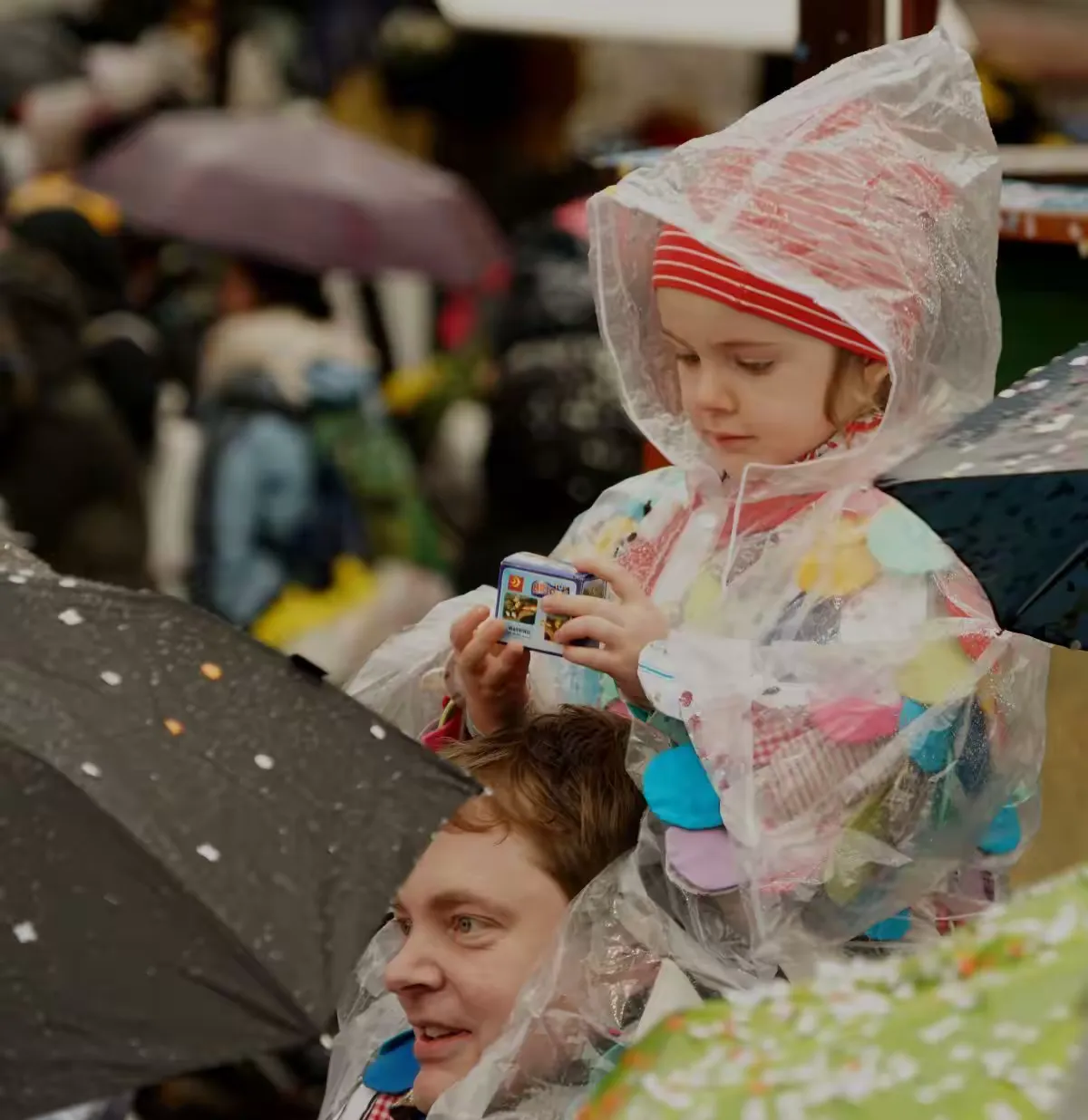大雨中,小王子兴致勃勃看着游行队伍。胯下的老爸有点狼狈哦。