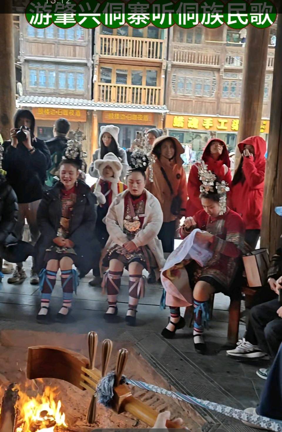 我走到肇兴侗寨景区中心地带,远远就听到了一阵一阵的侗族民歌传来,我走到钟鼓楼下一看都是一些观众围着几个侗族民歌表演者。木柴燃烧起来,男青年表演者坐在女青年表演者对面一排,大家你一句我一句深情地唱起来,大家听得津津有味可无法理解,经了解才知道侗话里的内容情深似海。