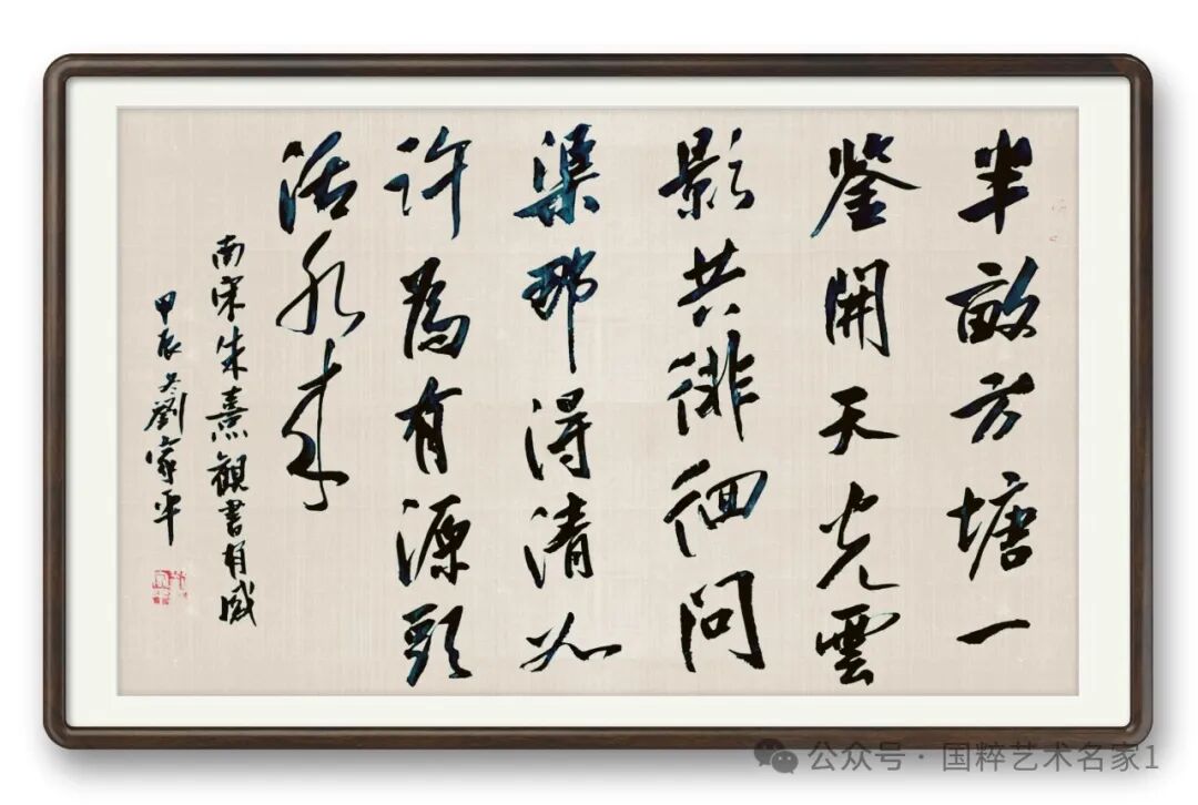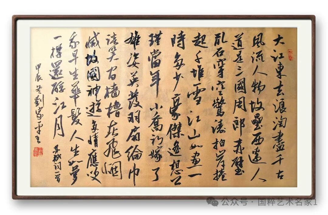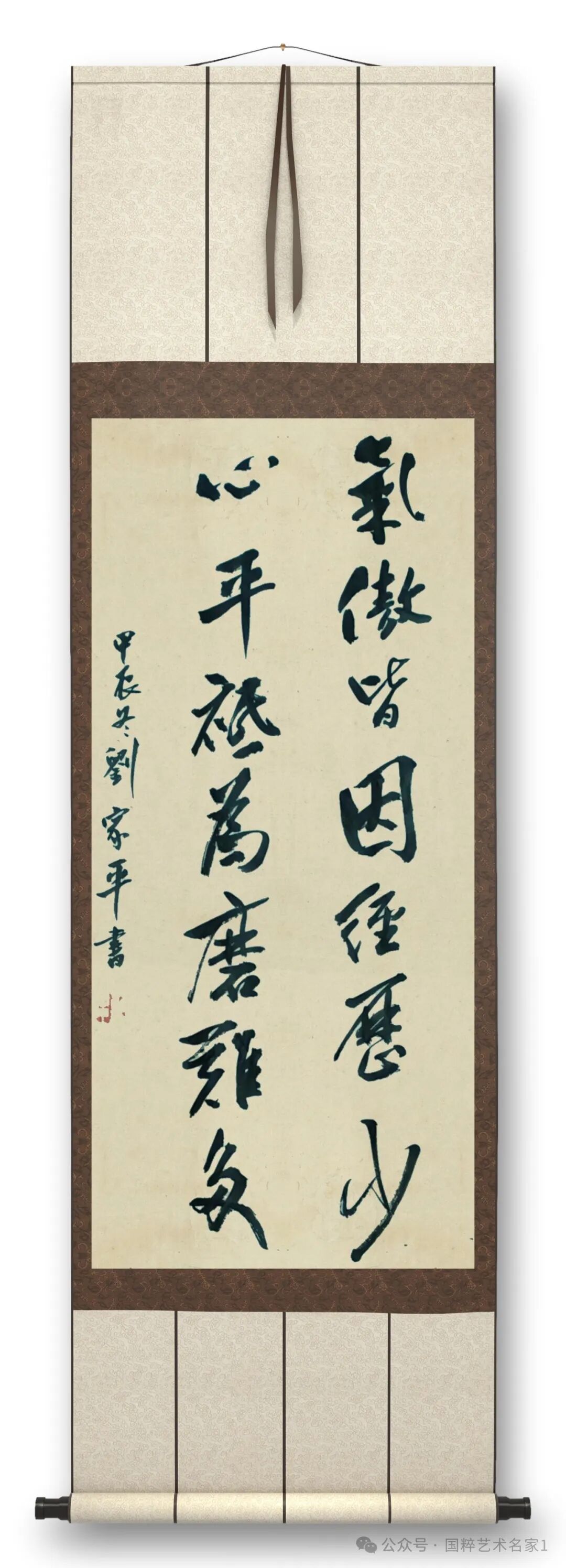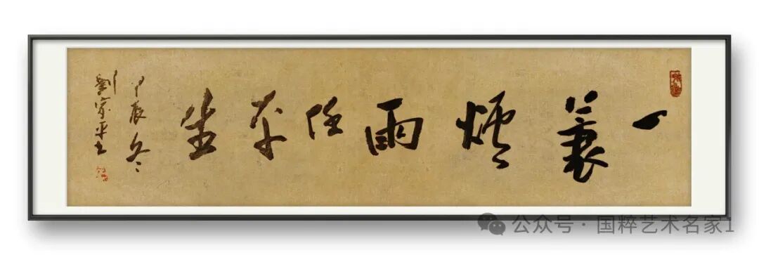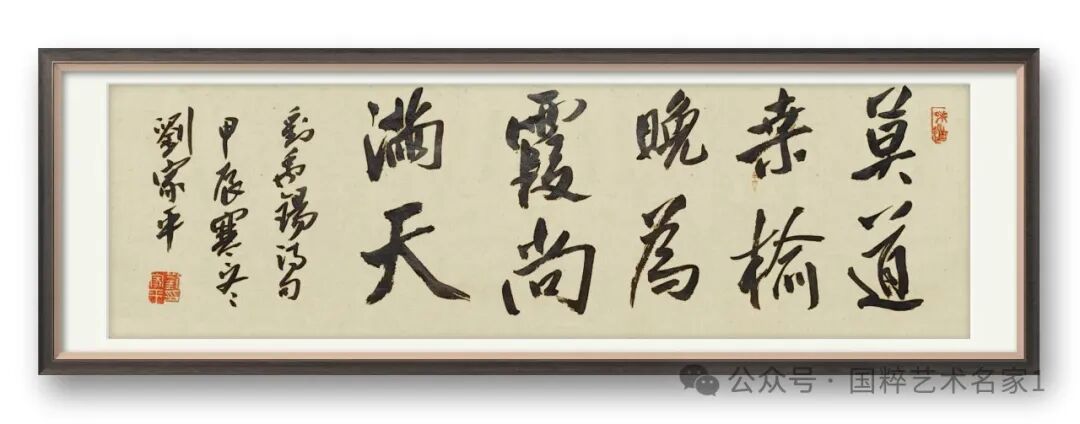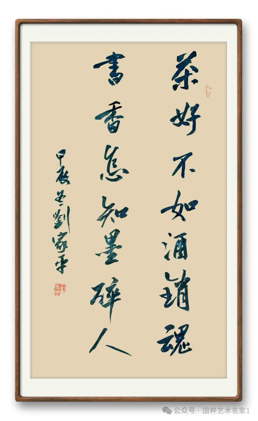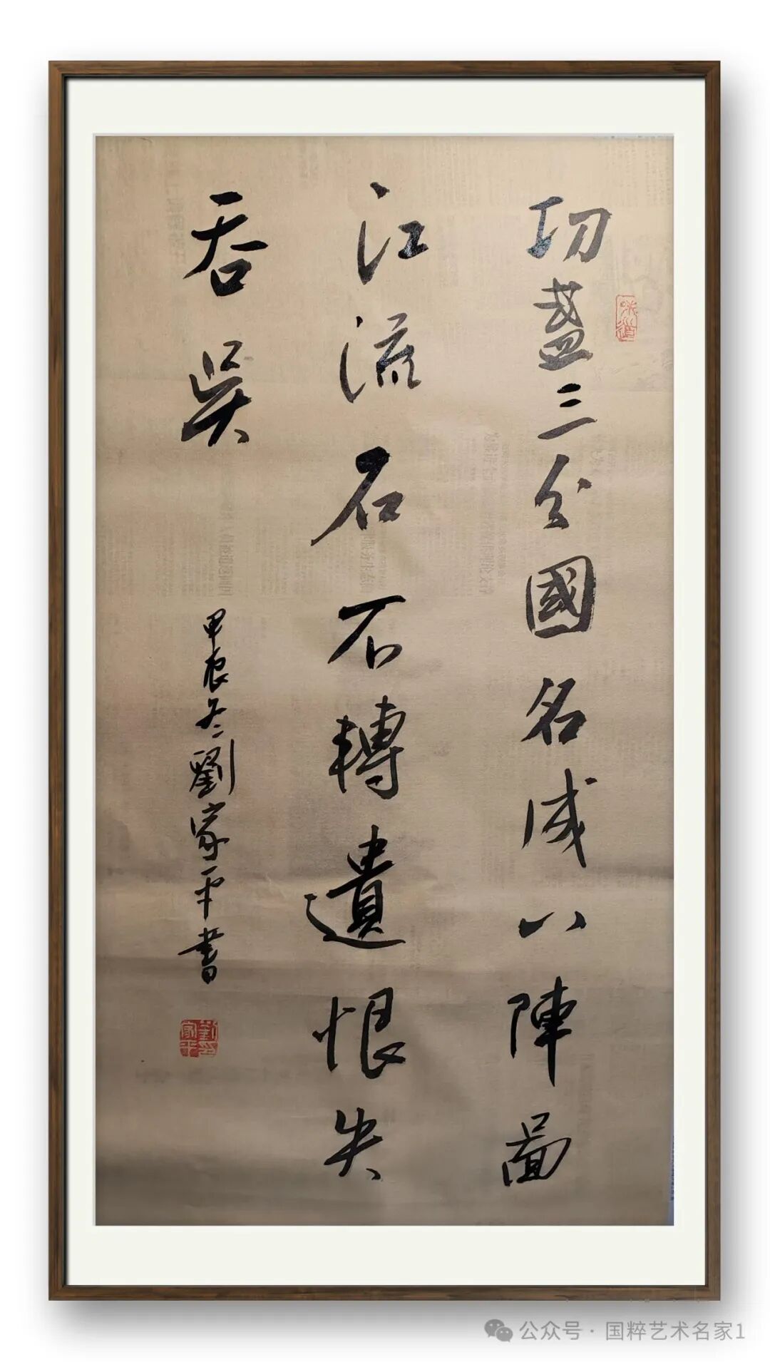 正所谓纵横有象者,方得谓之书矣。刘家平先生正是深得此意,其行草运笔浑厚凝重,含蓄奔放,笔墨收放自如,不渝规矩,线条粗细枯润,变化有度,字势如字义,通篇字体展阴阳之刚柔,开雄逸之气势。显然,先生是成功的达到了形意结合的行草境界,他以干裂秋风,润含春雨的笔墨,为行草呈现了一种斗酒十千恣欢谑的艺术豪情,行草书法的语境和气势也由此得以展现,实乃严谨疏放而不失稳正洒脱!