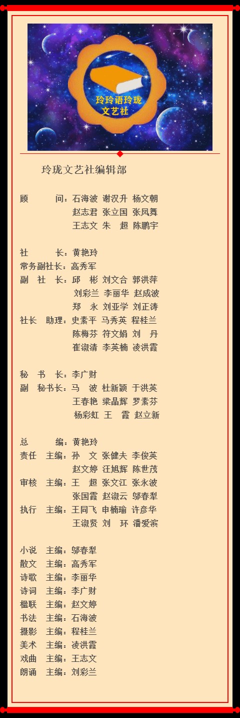 【玲珑心语]《玲玲语玲珑》文艺社(简称玲珑文艺)是文艺爱好者的圣地,是创作的乐园。本平台从多角度、多方位、多层次全面展示文艺爱好者的才华。《玲玲语玲珑》文艺社的文艺爱好者有一腔对文学和艺术的痴情,以诗心装饰凡心,以美景净化俗心,以声音温润儒雅,以真情消弭矫情,以积极豁达的阳光心态行走在文学和艺术空间,用文学和艺术表达着自己对人生、情感乃至生命的温暖诉求。《玲玲语玲珑》文艺社已经敞开了宽广的胸怀,来吧朋友,带上你的激情,带上你的憧憬,带上你的浪漫,带上你的婉约,带上你的狂放,带上你的美景。以诗为媒,以文会友,以景结情,以声投缘,愿你我携手同行。《玲玲语玲珑》文艺社设有十个专题:小说、散文、诗歌、诗词、楹联、书法、摄影、美术、朗诵、戏曲,欢迎文艺爱好者踊跃赐稿、大力支持!