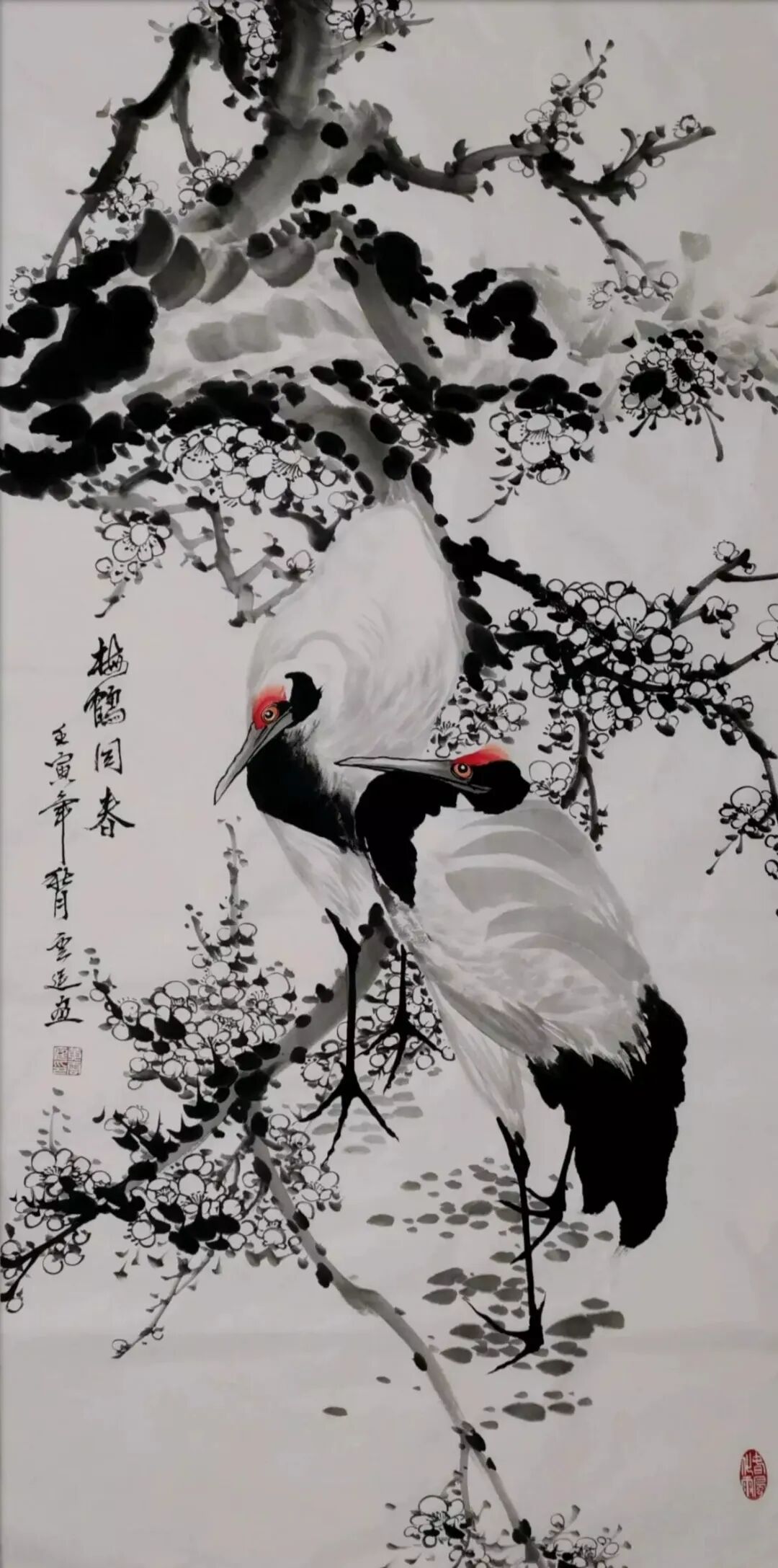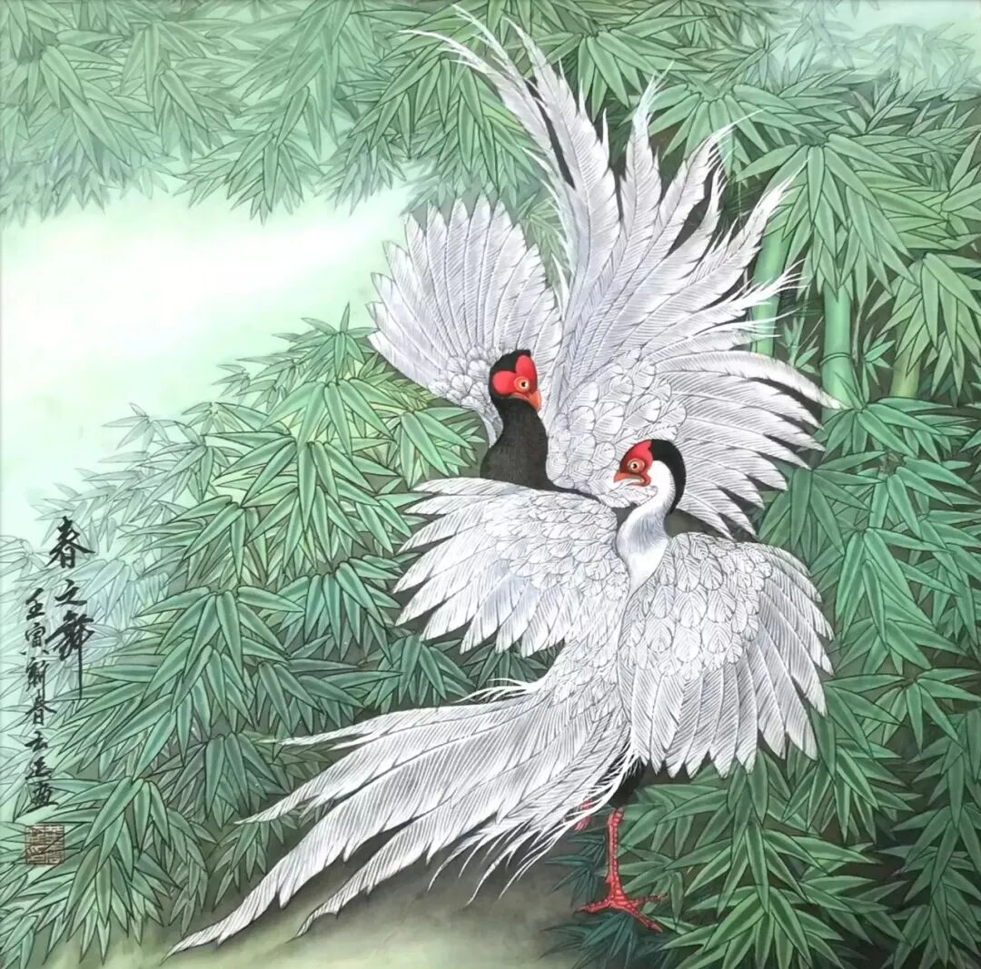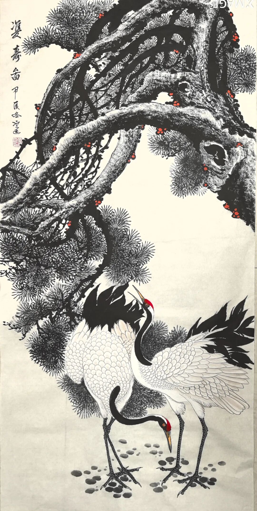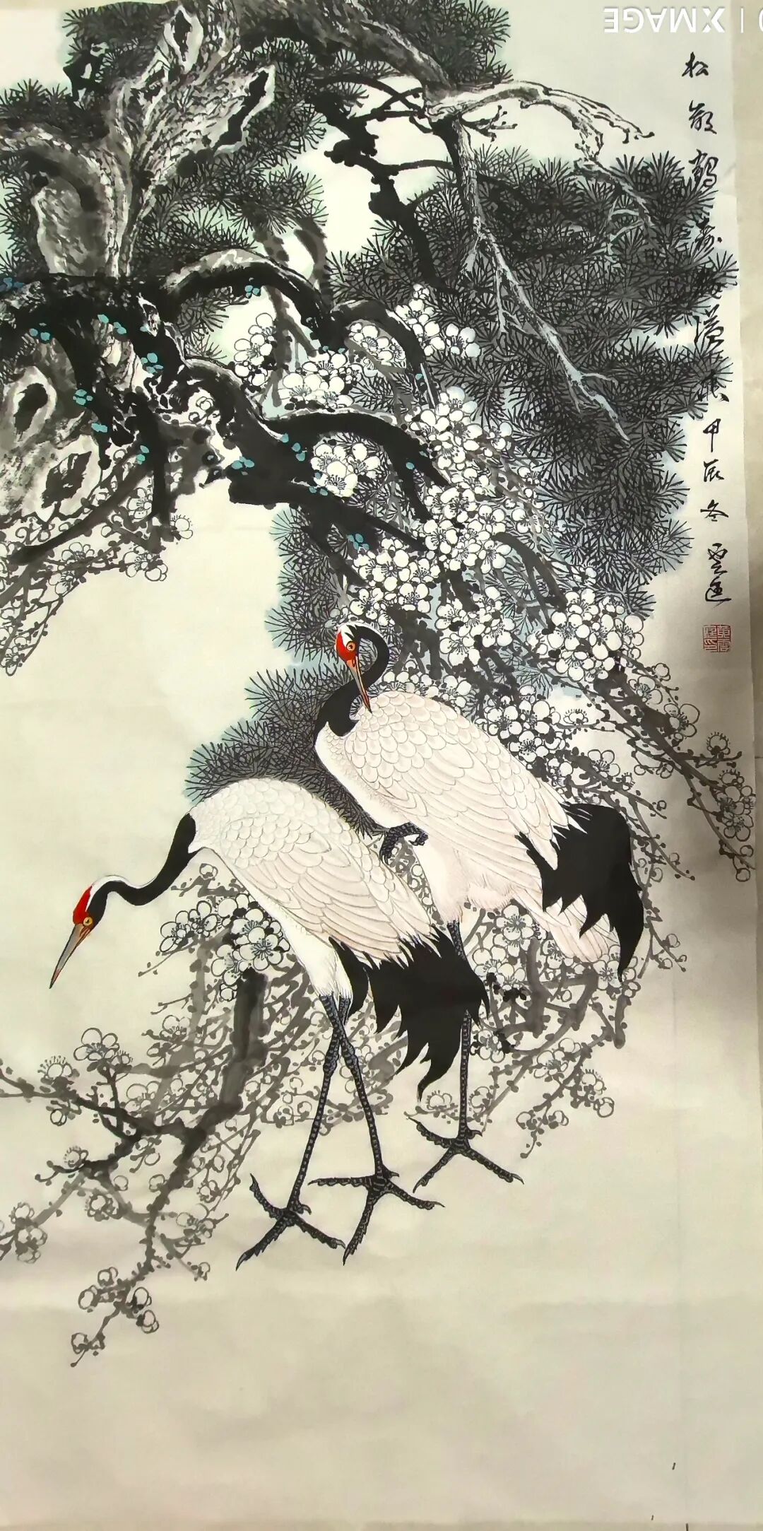 再看先生的松下丹鹤画,更是匠心独运!工写兼备中,足见天然真趣,青松挺立风骨苍拙,老枝斑驳,松针华秀,右侧横出筋骨毕露,虽疏密交错却不紊乱,而是参差向背,各自条畅!如松风在耳,似林影弭窗。松下仙鹤,或展翅亮嗓,或垂首啄食,笔线精细可见纤毫毕现,着墨缣素本色,鹤膝务要遒劲。而如此深具禅机玄妙的丹青佳作,一览也正如管中窥豹,可以在画中蒙味天然野态,写貌物情,摅发人思!