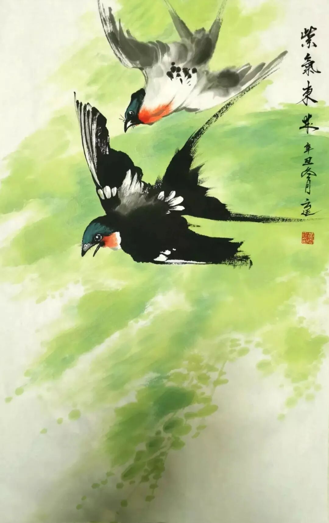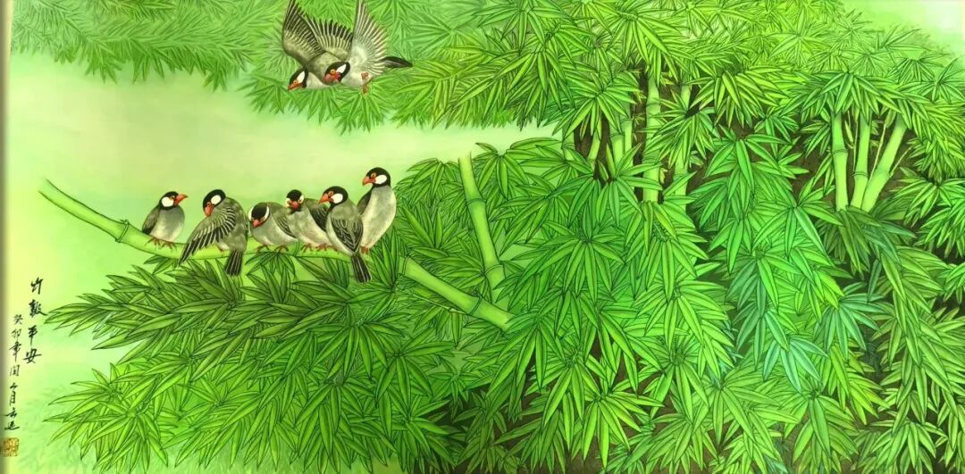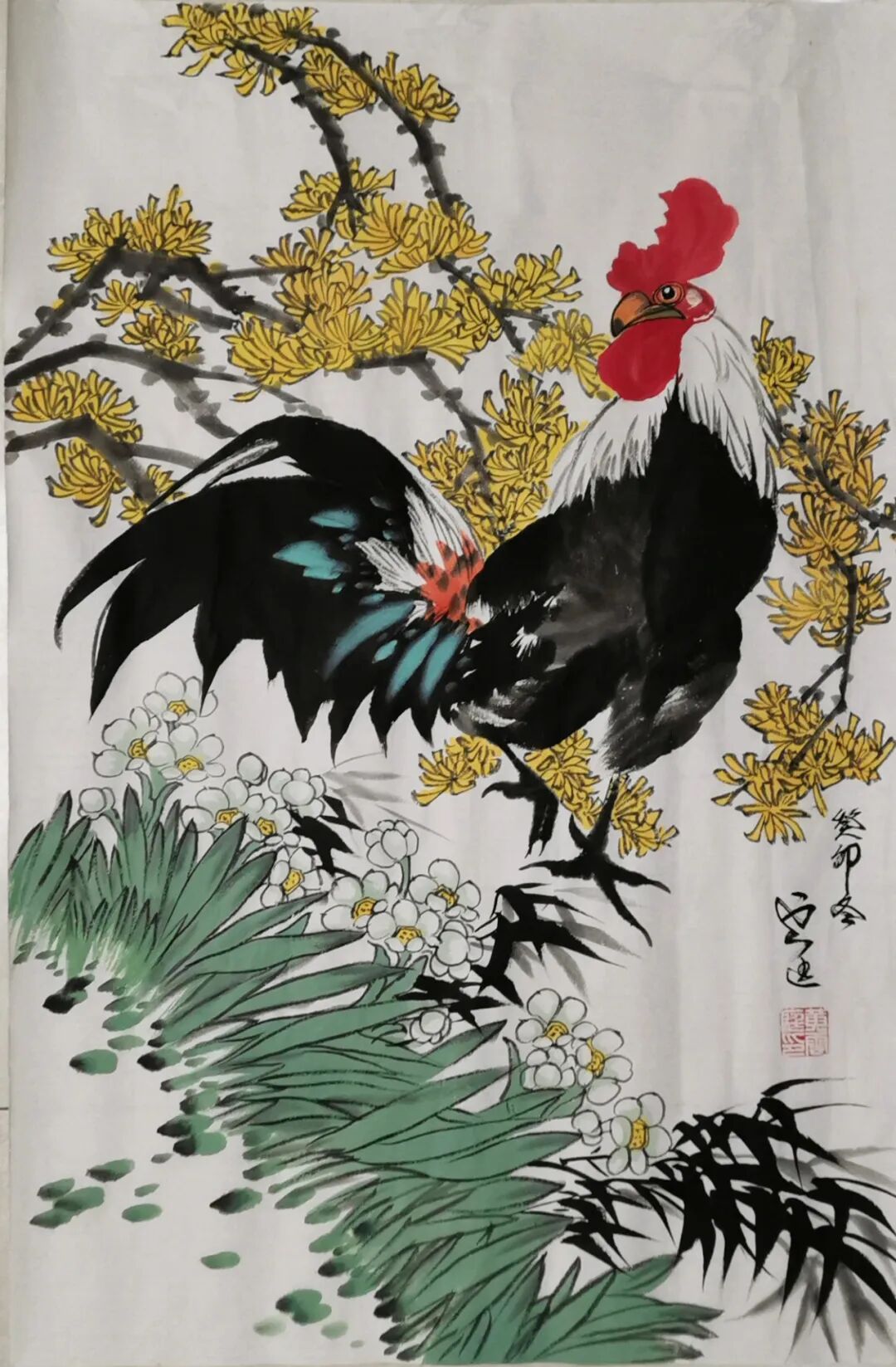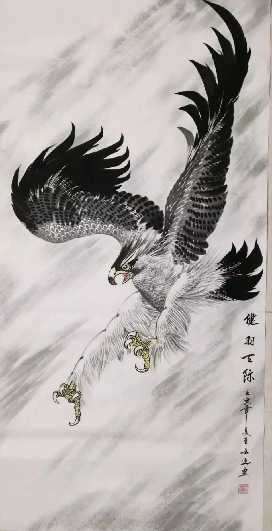 再看先生的松下丹鹤画,更是匠心独运!工写兼备中,足见天然真趣,青松挺立风骨苍拙,老枝斑驳,松针华秀,右侧横出筋骨毕露,虽疏密交错却不紊乱,而是参差向背,各自条畅!如松风在耳,似林影弭窗。松下仙鹤,或展翅亮嗓,或垂首啄食,笔线精细可见纤毫毕现,着墨缣素本色,鹤膝务要遒劲。而如此深具禅机玄妙的丹青佳作,一览也正如管中窥豹,可以在画中蒙味天然野态,写貌物情,摅发人思!