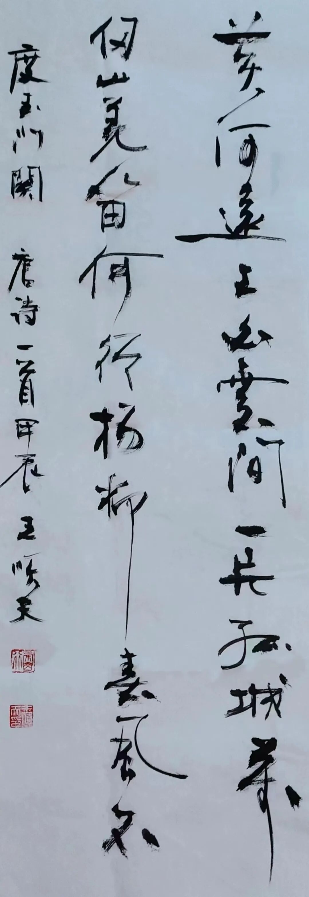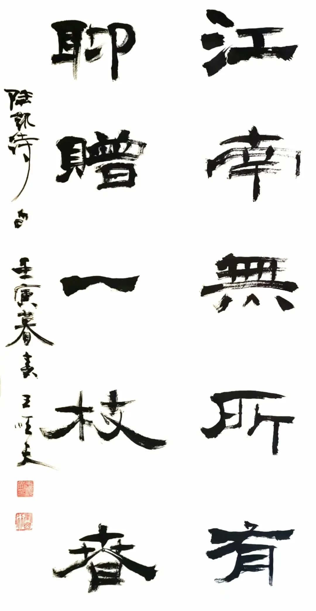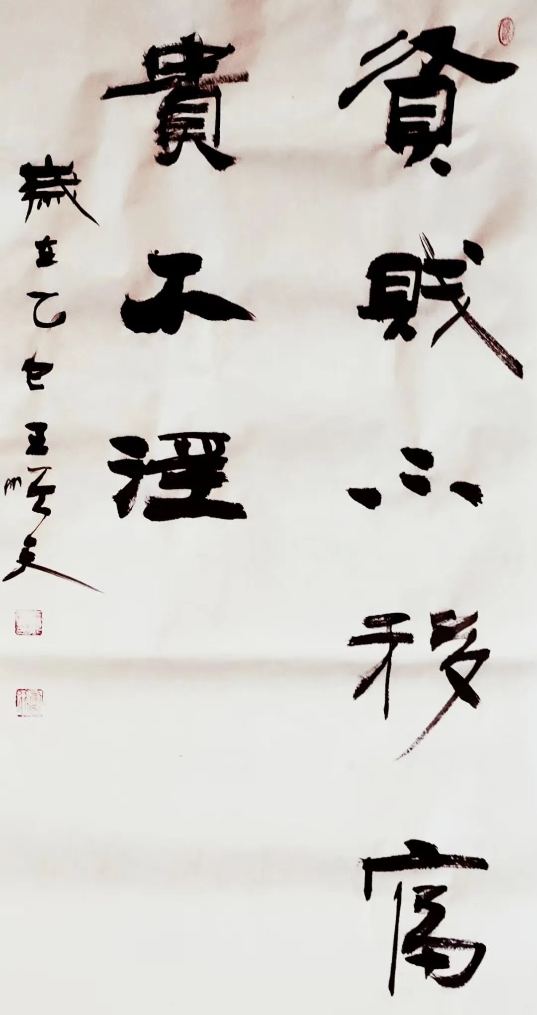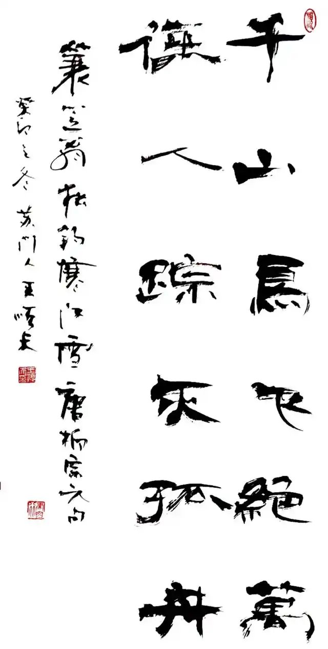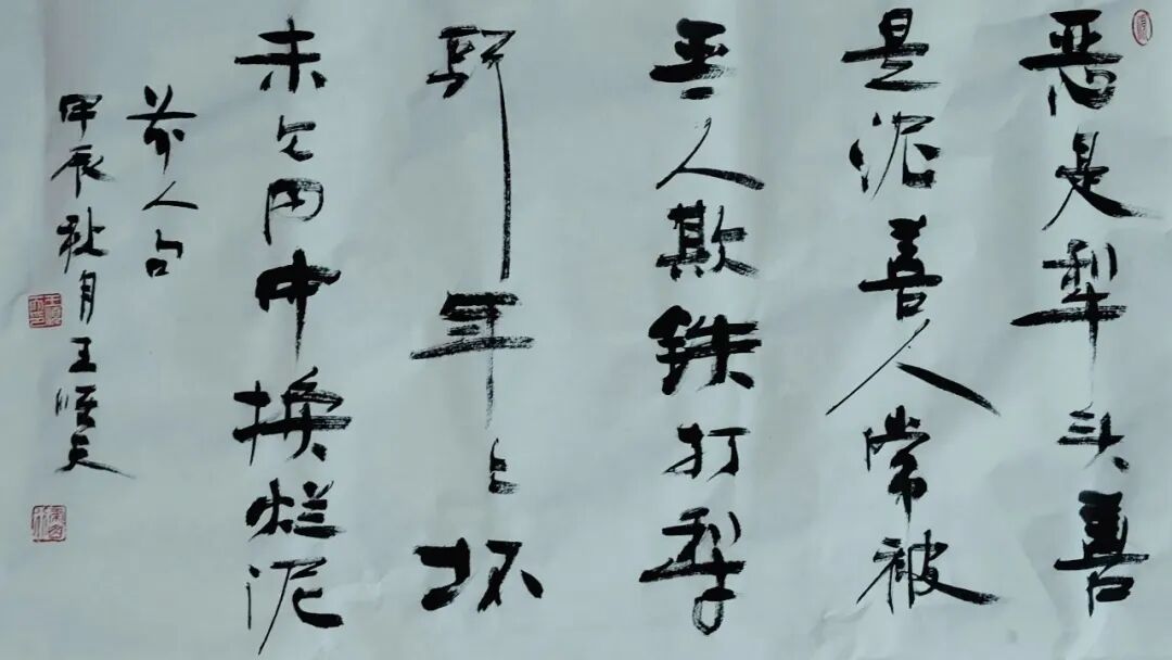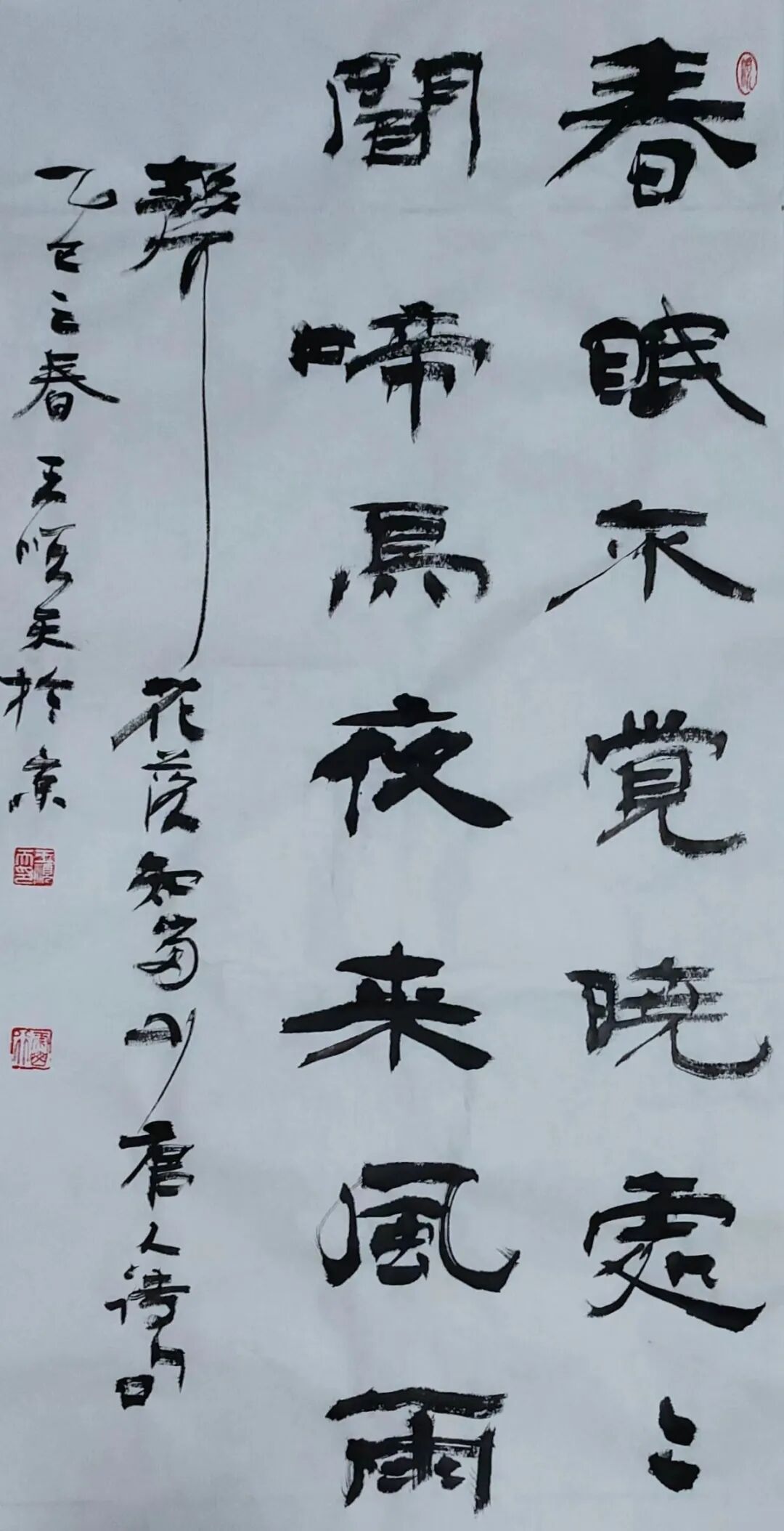 读王顺天先生的书法体势,可见他是熔铸了行、隶二体之精髓。方圆笔意相生相发。其运笔之妙,或逆锋蓄势,如老树盘根,尽显浑朴苍劲;或悬锋直下,若崩崖坠石,自得雄强气象。尤善以枯锋散毫作书,笔墨蹦茬处,恰似千年碑碣历经风霜之蚀痕,古意盎然。通幅章法经营也是疏密有致,劲涩处万毫齐力,密不透风;空灵处笔断意连,疏可走马。其中方笔转折最可称绝,如干将发硎,截金断玉,铿锵有力!正所谓笔笔分明而又气脉贯通,刚健中含清正,古拙中见章法,铁画银钩,正当如是!