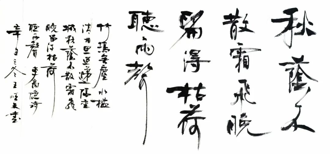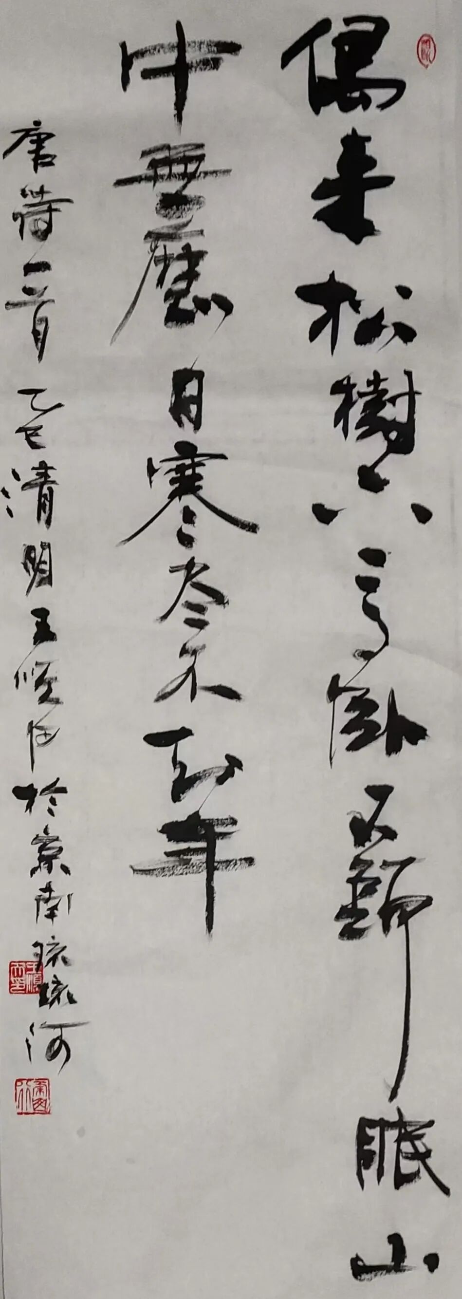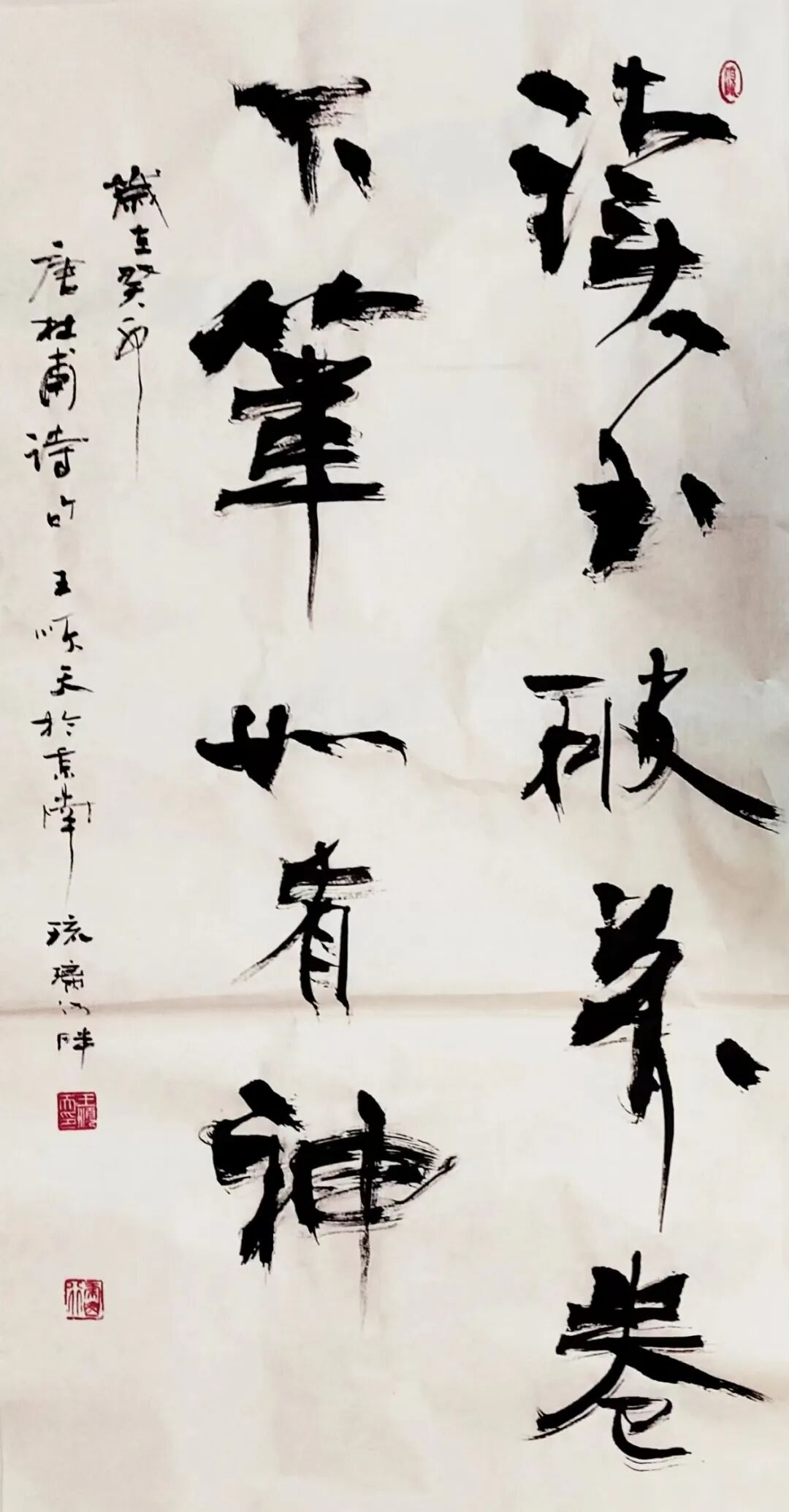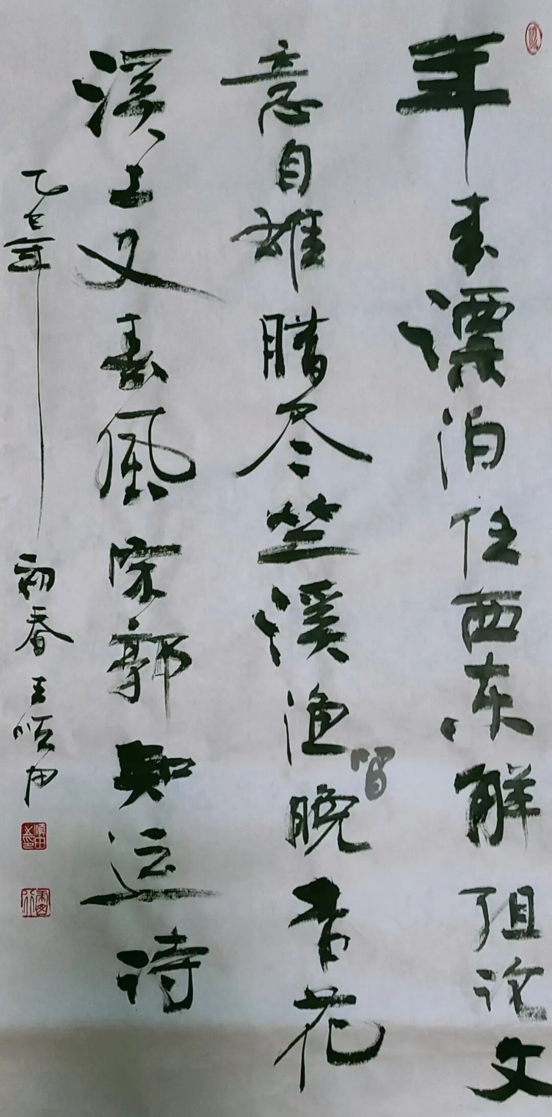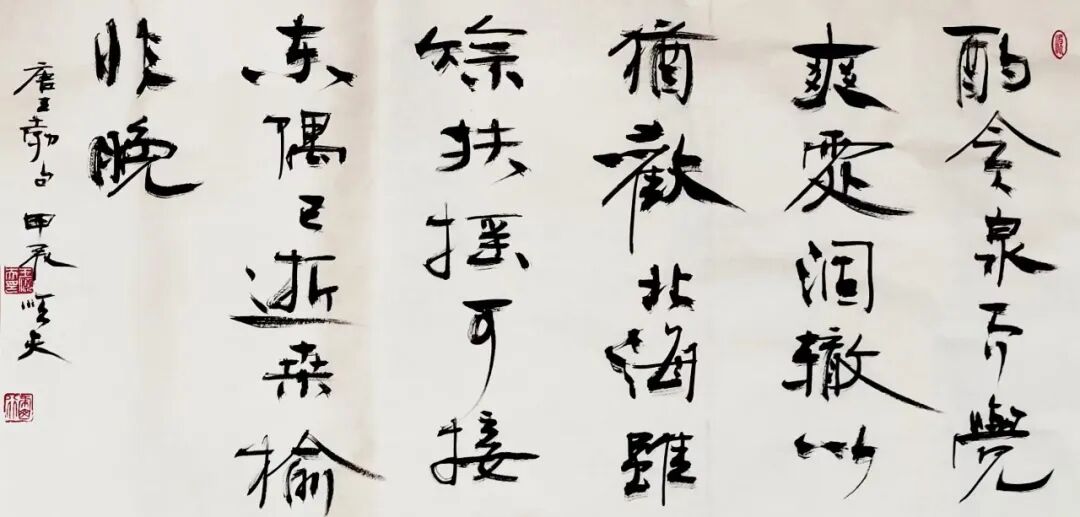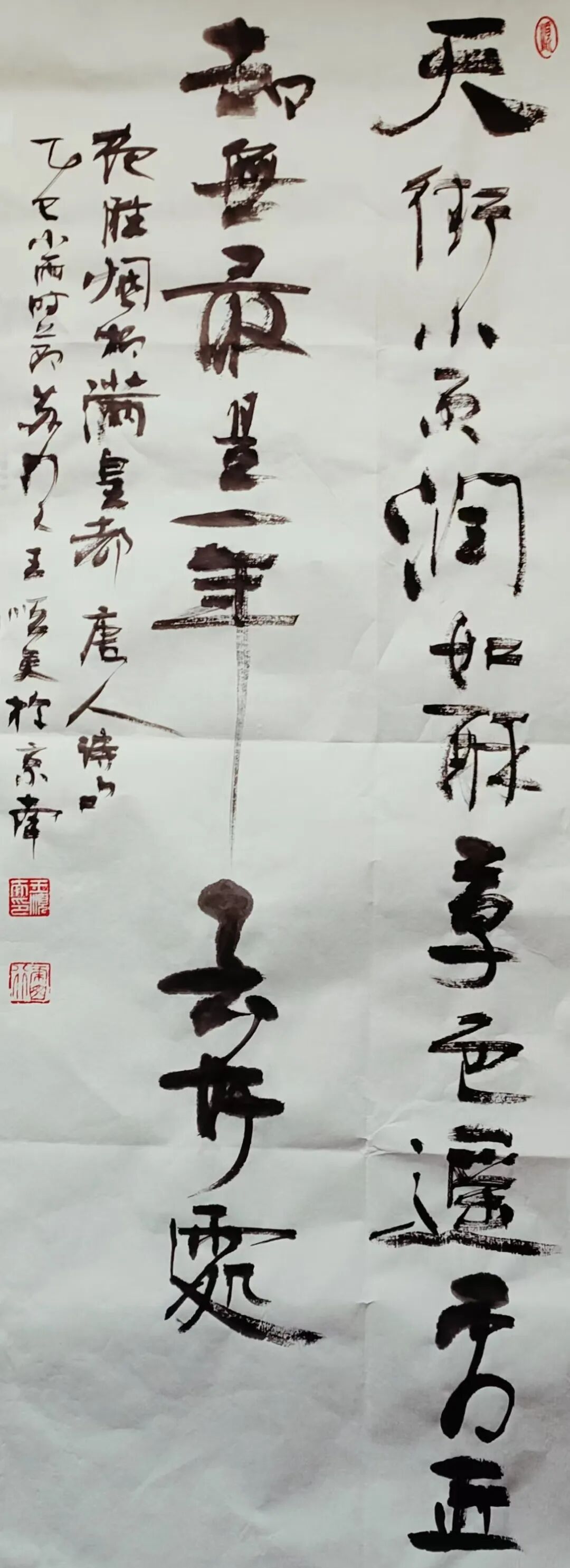 读王顺天先生的书法体势,可见他是熔铸了行、隶二体之精髓。方圆笔意相生相发。其运笔之妙,或逆锋蓄势,如老树盘根,尽显浑朴苍劲;或悬锋直下,若崩崖坠石,自得雄强气象。尤善以枯锋散毫作书,笔墨蹦茬处,恰似千年碑碣历经风霜之蚀痕,古意盎然。通幅章法经营也是疏密有致,劲涩处万毫齐力,密不透风;空灵处笔断意连,疏可走马。其中方笔转折最可称绝,如干将发硎,截金断玉,铿锵有力!正所谓笔笔分明而又气脉贯通,刚健中含清正,古拙中见章法,铁画银钩,正当如是!