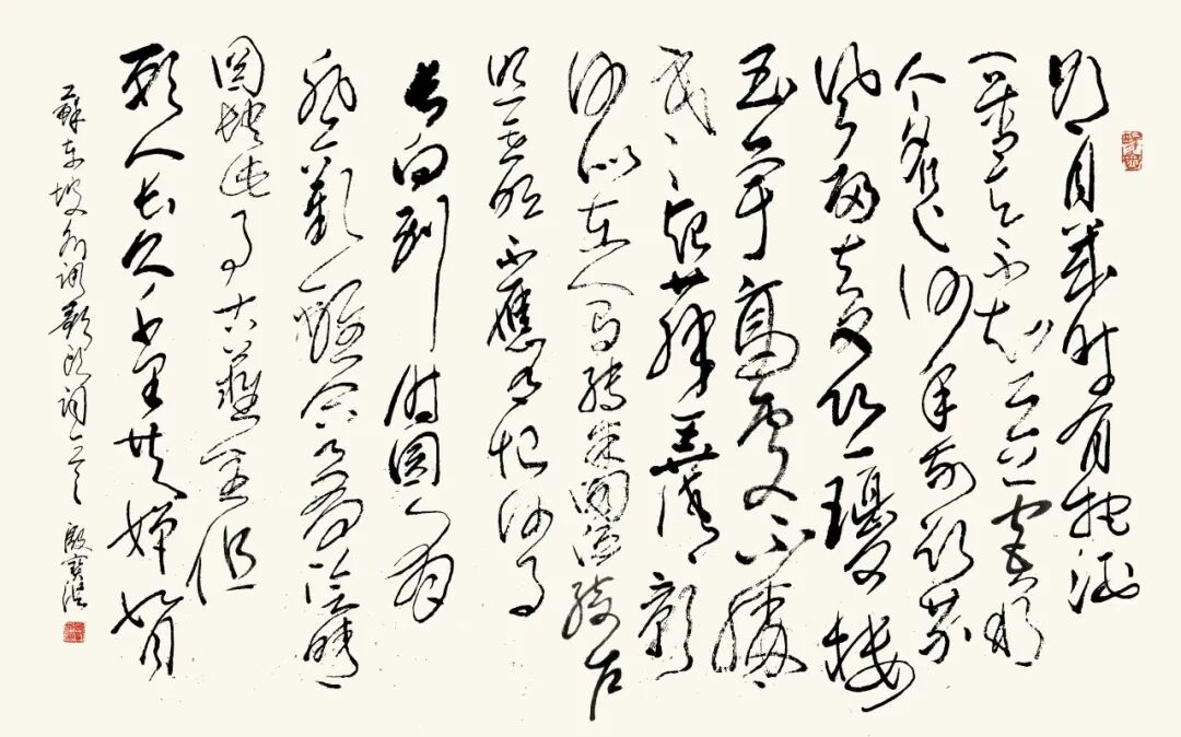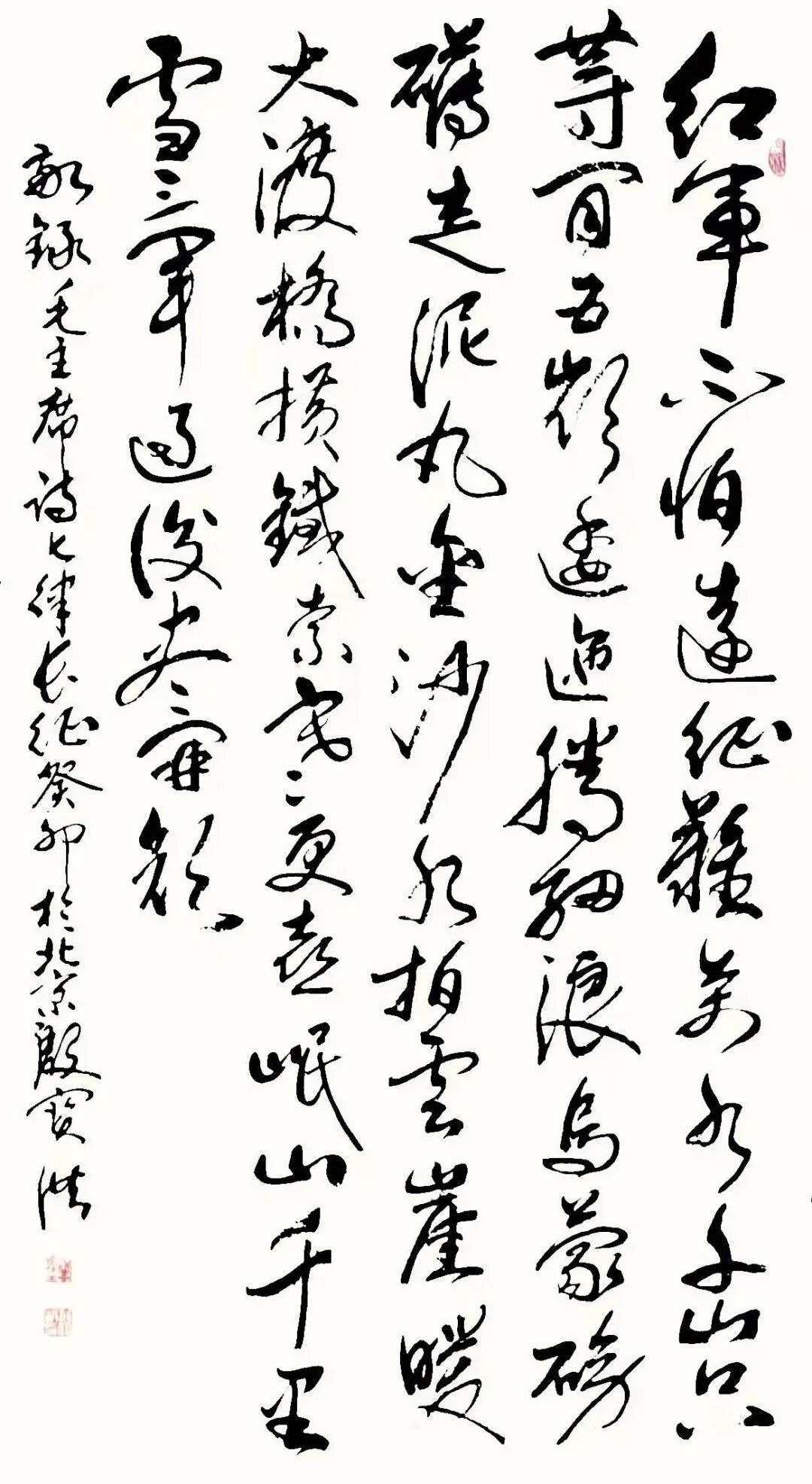 不懈的信念和精神,付书于刻苦和勤奋。尤对欧字意求之更殷。既有池水尽墨之力,又有善诣三昧之睿。逐笔逐字潜心探赜于使转间,寻其遣毫命锋之微,于结字中索其匠心妙造之然。面对书求变体,字追异形,功利当先的纷杂市景,其作品清正而明爽,真水而无香。遒迈雅健,静穆生动。