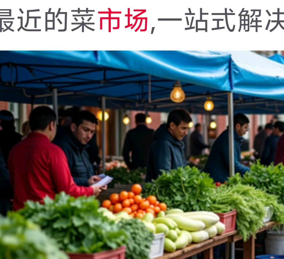 弯月挂晴空,早市兴隆。绵延货架摆长龙。肉蛋鱼虾葱韭蒜,瓜果颇丰。