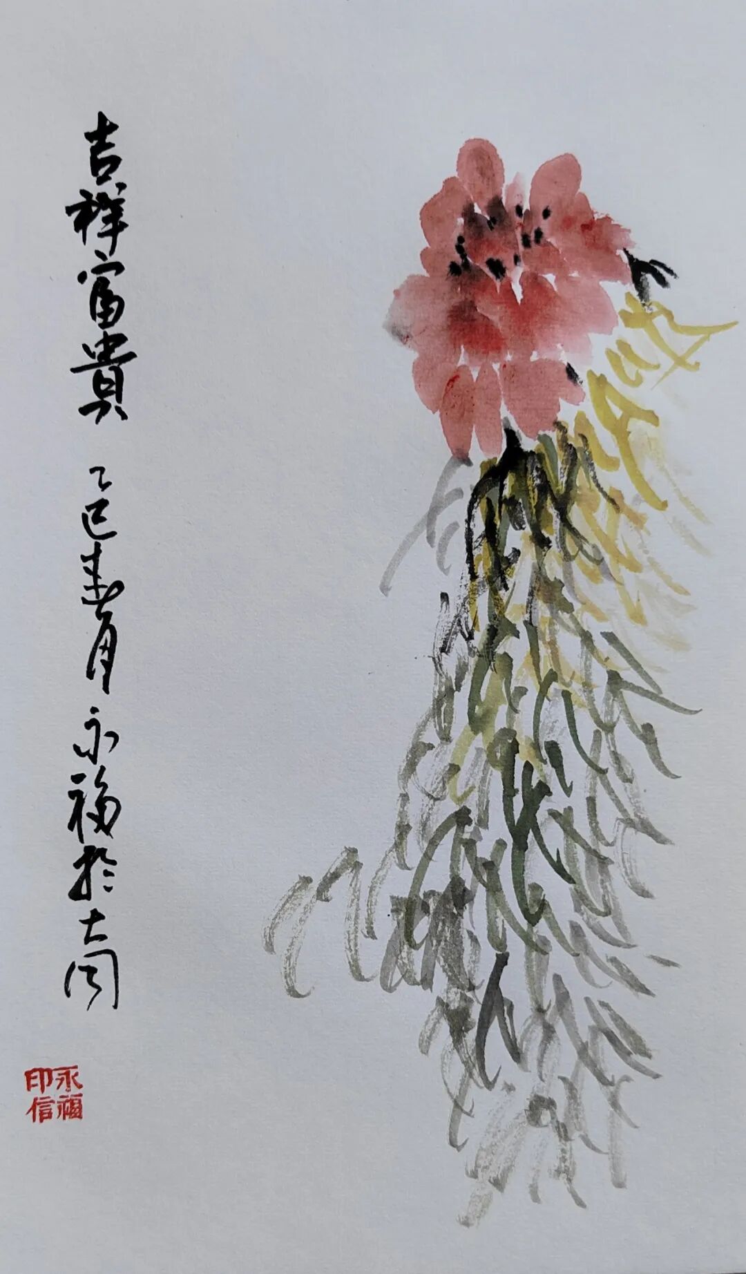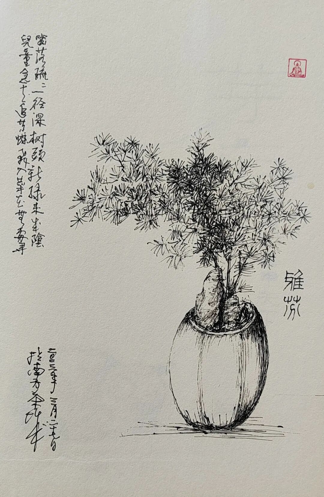 笔墨超绝,传染得宜,意趣有余者,谓之妙品。这是我对张永福先生书画作品的第一印象。看他的画作,显然是继承了至净至简的写意宗旨,往往寥寥数笔便能营造出空灵淡远的意境。观其笔下的一枝寒梅、半叶残荷,或孤石野径,皆能删繁就简,去芜存菁,遂在极简的构图中蕴含无限生机,一览天然妙趣!不事雕琢之痕,惟存清气浮动,朴素中蕴含妙美,平淡中自有味象。而这些看似信手拈来的山水小品、花鸟写意,实则也都是张永福先生经年累月师法造化的提炼结果。蒙味于心,是谓格物致知!