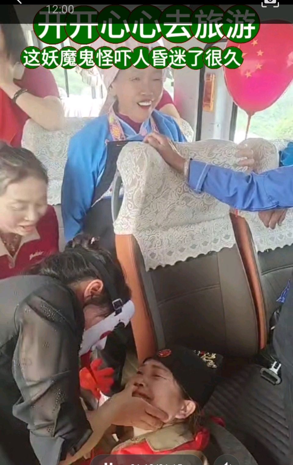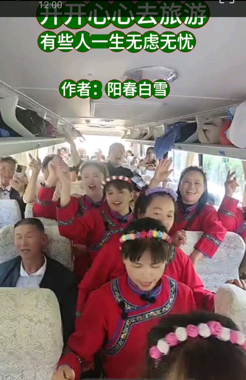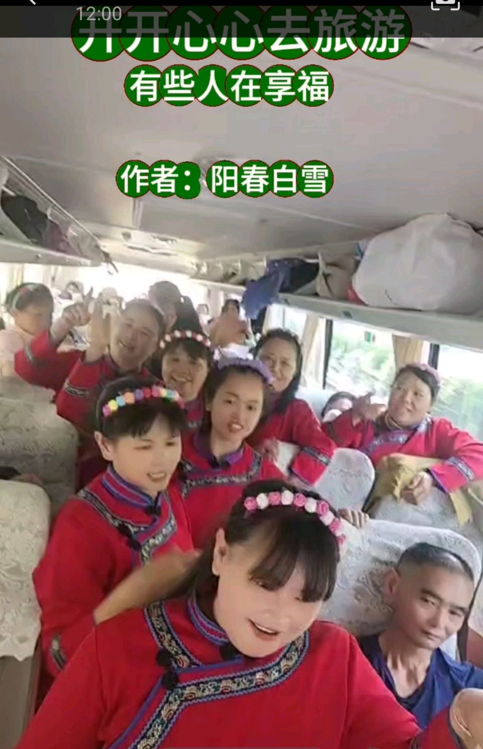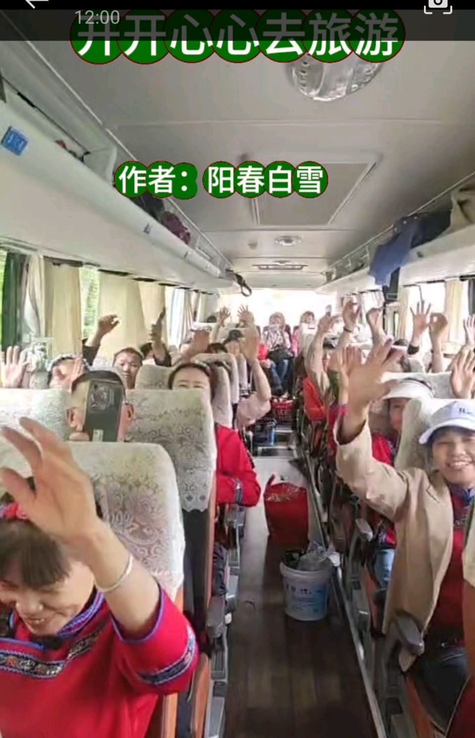 旅游车继续快速行走,车上的游客大部分都是老奶奶和六十多岁的老头。他们放声歌喉,欢欣鼓舞,双手在空中飞舞,仿佛瞬间忘掉了忧愁。这时候,又表演节目:新郎与新娘一生永牵手,游客们看了以后,差点像丢了魂魄的老猴:妈唷?哎唷!这欢声笑语中还有惊恐的悬念在心里头。你说舒服不舒服?