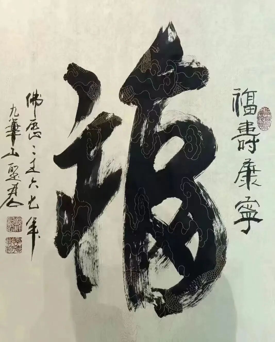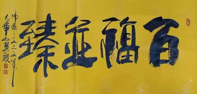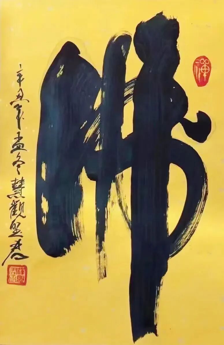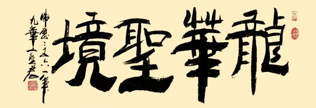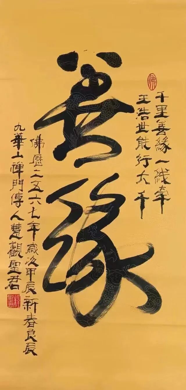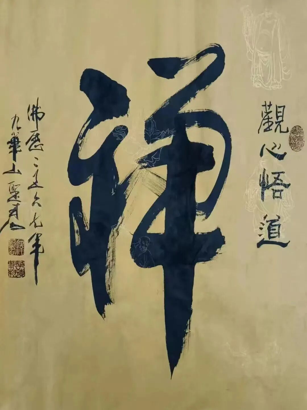 一幅幅榜意真功,深得浩然荡气。斗笔落墨,沉着遒健,每一幅大字,也都大致是可分为两个特点,一是“清正”,提笔写就立意至高,是在澄神静虑中下笔,亦是在端己正容时稳思审之。从而定志以帅其气,养气以充其志。其二为"雄畏"之象,其榜书笔力千钧,气贯满幅。字字之雄厚,实乃肃穆巍然,故对观其书,犹如仰岱岳之巍峨,临沧海之浩瀚,可以绝去纤巧妍媚之态,摒除柔弱取媚之姿。尤为可贵者,则在于他能将禅宗的“明心见性”与书法的“技道双全”熔于一炉,使点画之间既见佛门乾坤,又显心性本源。所谓树之为勋猷,立之为节操,万法归一,正当如是!