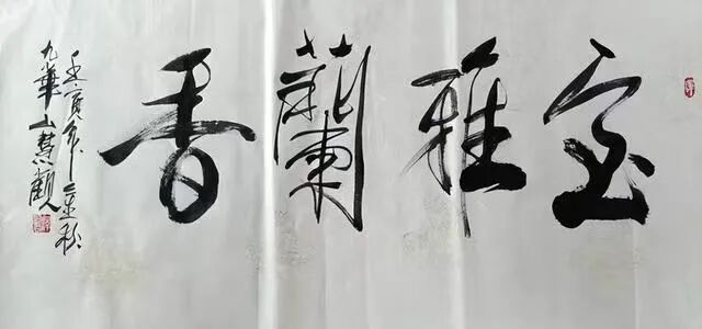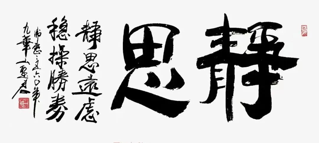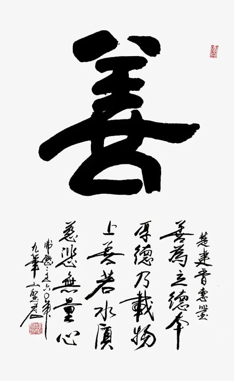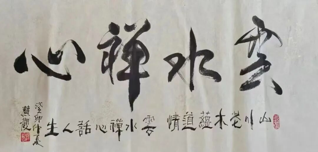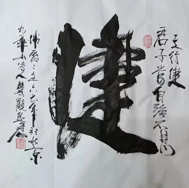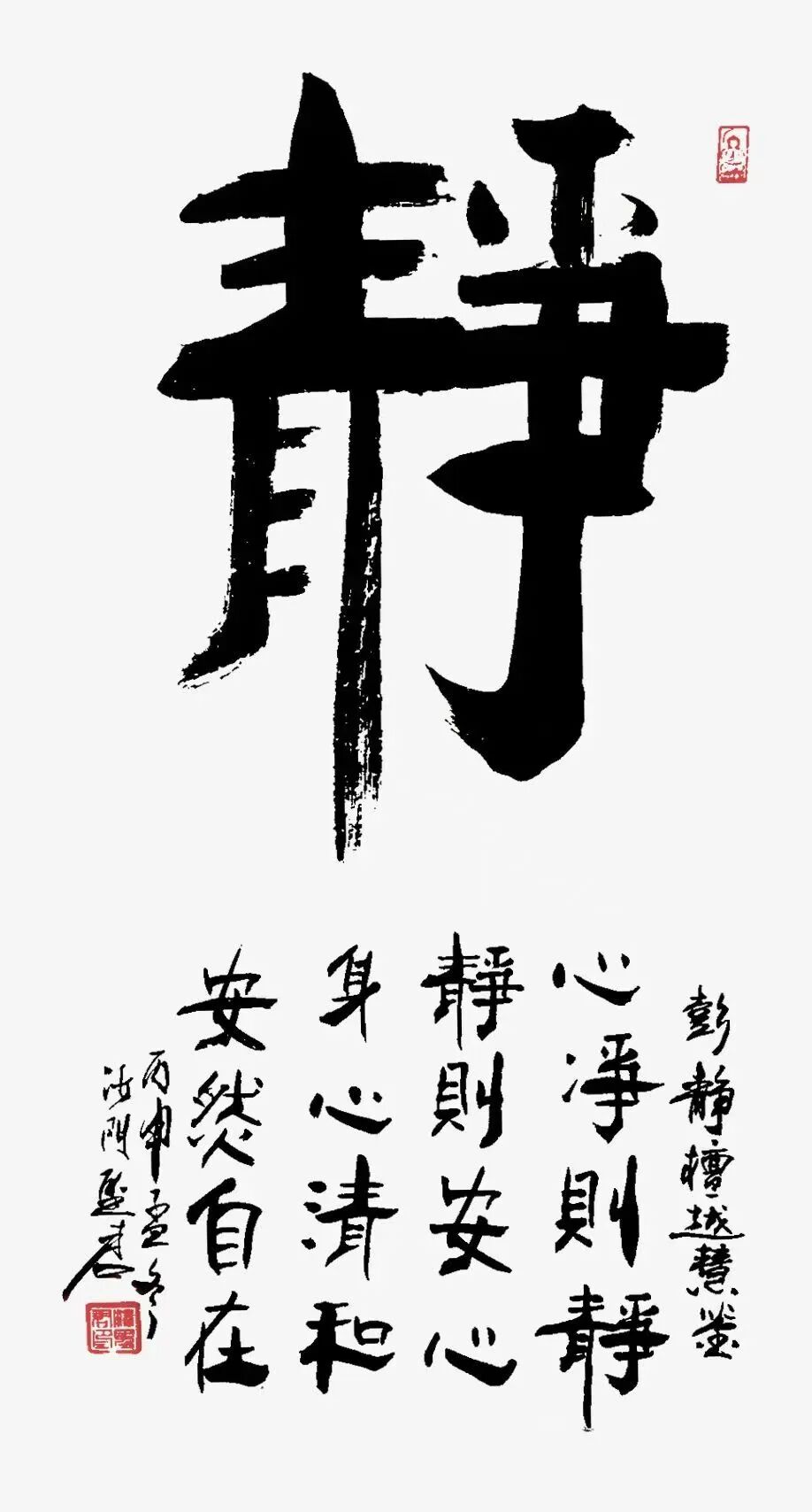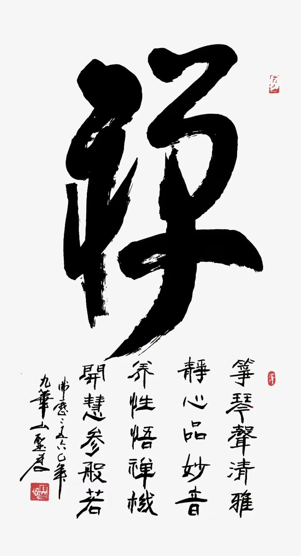一幅幅榜意真功,深得浩然荡气。斗笔落墨,沉着遒健,每一幅大字,也都大致是可分为两个特点,一是“清正”,提笔写就立意至高,是在澄神静虑中下笔,亦是在端己正容时稳思审之。从而定志以帅其气,养气以充其志。其二为"雄畏"之象,其榜书笔力千钧,气贯满幅。字字之雄厚,实乃肃穆巍然,故对观其书,犹如仰岱岳之巍峨,临沧海之浩瀚,可以绝去纤巧妍媚之态,摒除柔弱取媚之姿。尤为可贵者,则在于他能将禅宗的“明心见性”与书法的“技道双全”熔于一炉,使点画之间既见佛门乾坤,又显心性本源。所谓树之为勋猷,立之为节操,万法归一,正当如是!