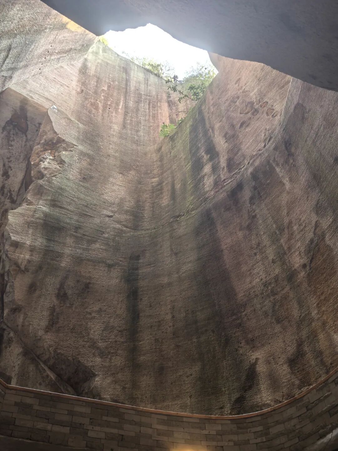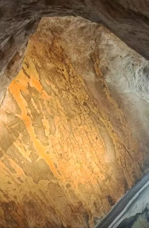 从图片中的“天漏痕”可看到,岁月在岩石上留下印记,雨水沿石壁流下形成独特纹路,或粗或细、或直或曲,这些自然痕迹如同书法线条,充满生命力。在古人的书法理论里,“屋漏痕”代表自然、质朴且有力的笔法,颜真卿就曾提到,书法线条应如屋壁间雨水渗漏的痕迹般自然沉稳。