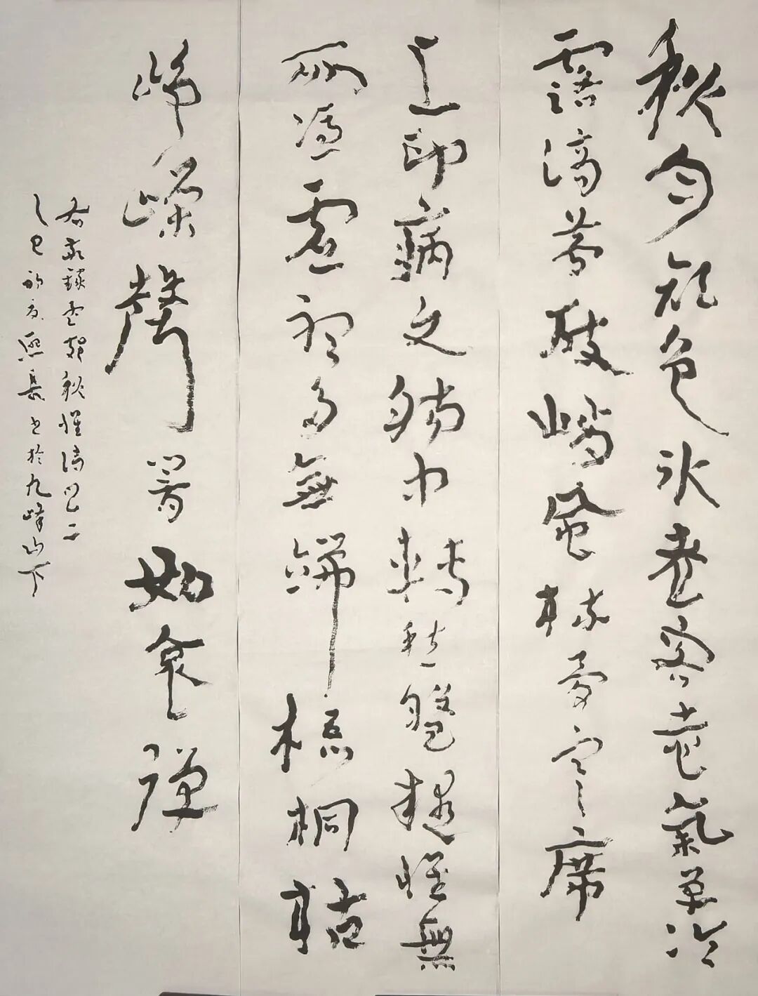 在书法实践中,要达到古拙野逸和天然浑成的境界,需将古人书写技巧与自然之美融合。书写时,借鉴钟鼎文朴拙线条,融入风化岩石般的粗糙质感,让笔墨自然流淌,使字的形态兼具古代经典的庄重古朴与自然的灵动随性,这样的作品才能彰显出书法艺术在古今融合中的独特魅力。
