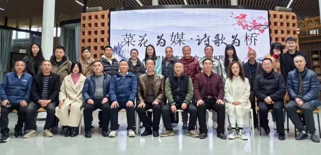 2024年3月16日,詹仕华(中)在德阳市德新镇五星村,“菜花为媒.诗歌为桥”踏春活动合影。前排左6詹仕华 ,后排左7李义忠