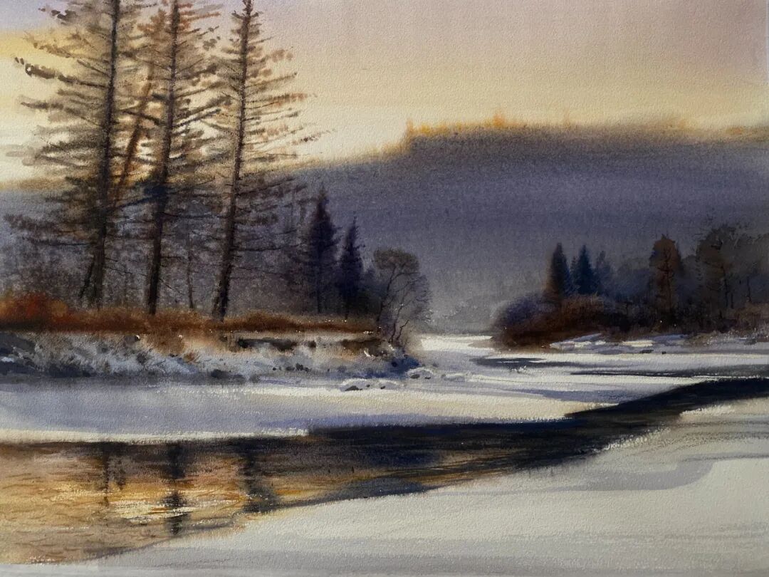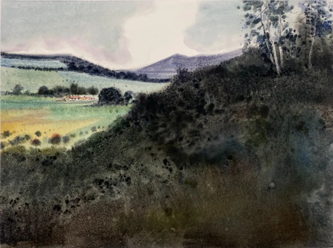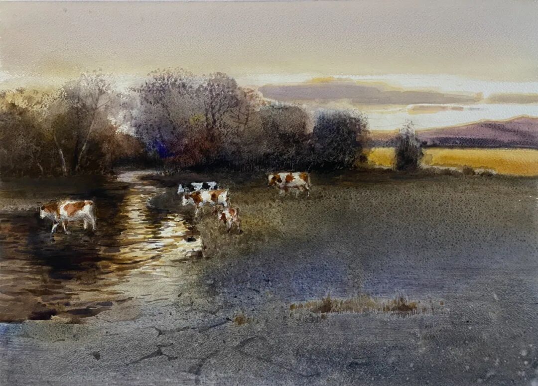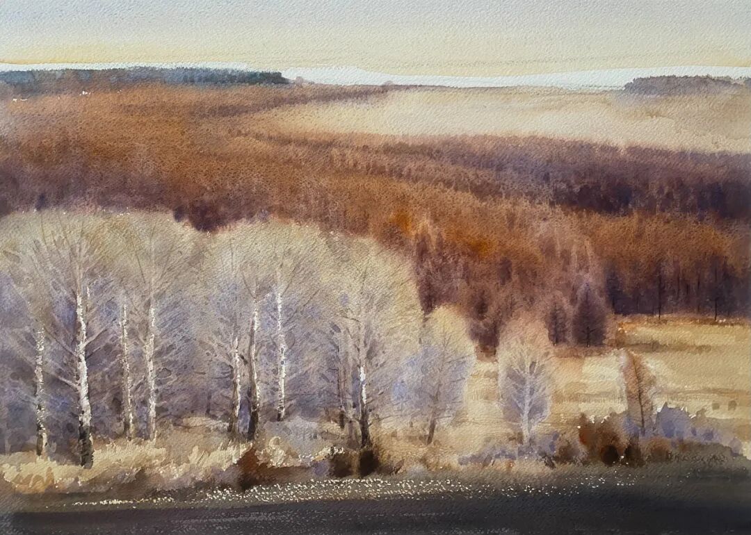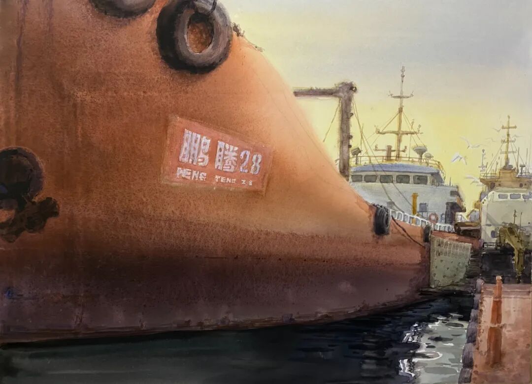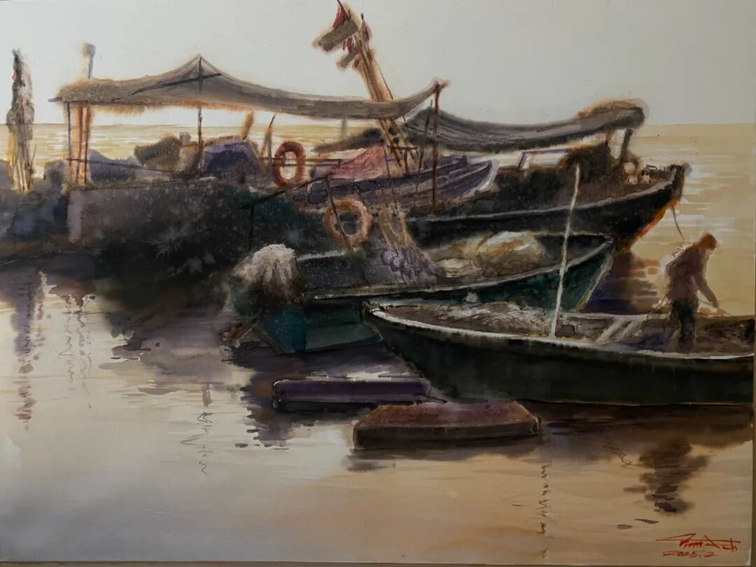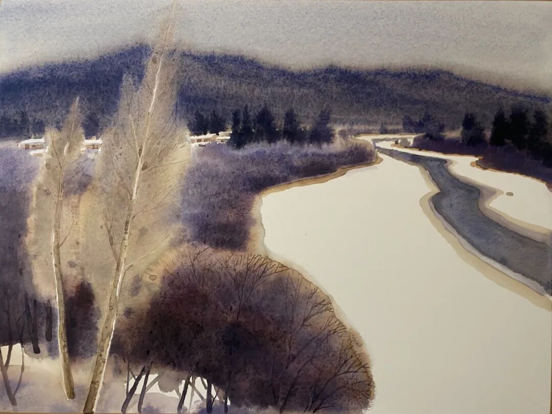 看胡晓东先生的作品,画中浓郁的东北地域特质扑面而来。广袤寂寥的黑土地、疏朗萧瑟的寒林、斑驳沧桑的渔船,无不透露出一种深邃的苍茫之感。而这些景象,也都是通过其独特的水彩语言得以完美呈现——在氤氲淋漓的渲染中渐次生发,于虚实相生间的层次中构筑意境。有形处水色精到,无形处色彩斑斓,不杂不乱,如蒙云雾,实乃纤尘不染。正如同传统水墨写意一样,胡晓东先生是将“画有尽而意无穷的”意境美抒发到了极致。