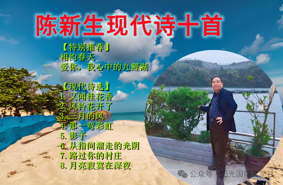 陈新生 福建福州中国历史文化名镇嵩口古镇人。中华诗词学会会学员、福建诗词学会会员、福建楹联学会会员、福州兰圃乡土文化研究会高级顾问、福州嵩阳诗社社长。美国纽约四海诗社基本社友。著有现代诗歌集《与清风对白》及古典诗词《且共闲云漫赋诗》,编辑出版了《嵩阳吟韵》《嵩阳诗社社员作品选》等。