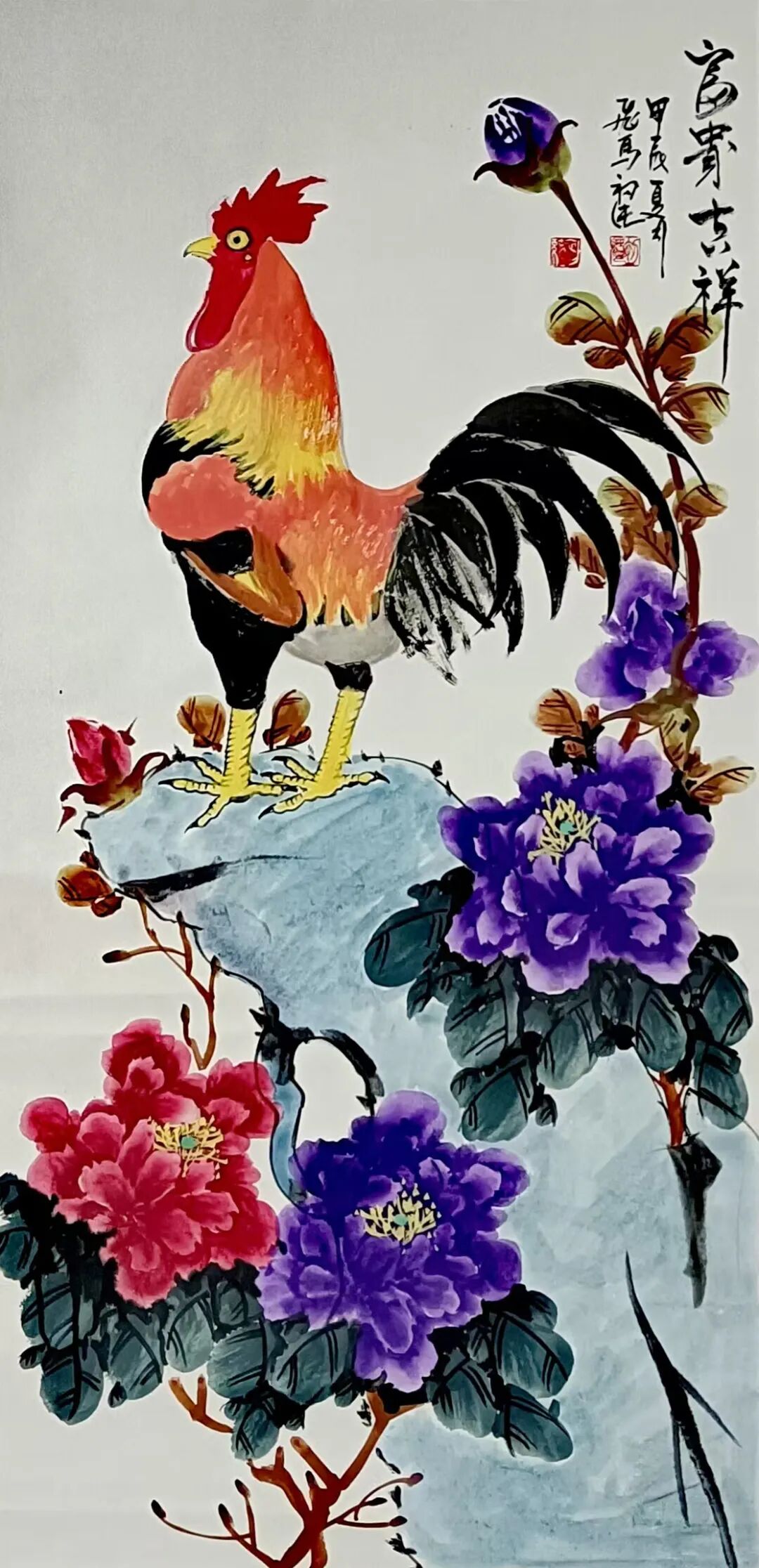 但总归来说,初纯先生的画还是地道的文人画,所谓典范,只是要比常人多了些浑雄气概,少了几分匠气俗韵。而这般艺术品格,也不禁令人联想起八大之孤傲、潘天寿之奇绝、李苦禅之洗炼……。先生之画,亦如此乎!在尺素间抒情达意,见牡丹浓姿华贵,堪称国色天香;又有笔下雄鸡,翎毛绚烂,精神抖擞;仙鹤则单足而立,脾睨万物,颇有桀傲神韵跃然于纸上!由此种种花鸟,看似工写兼备,实则都是写其心境也!所谓借物而传言,借画而道志,正当如是!