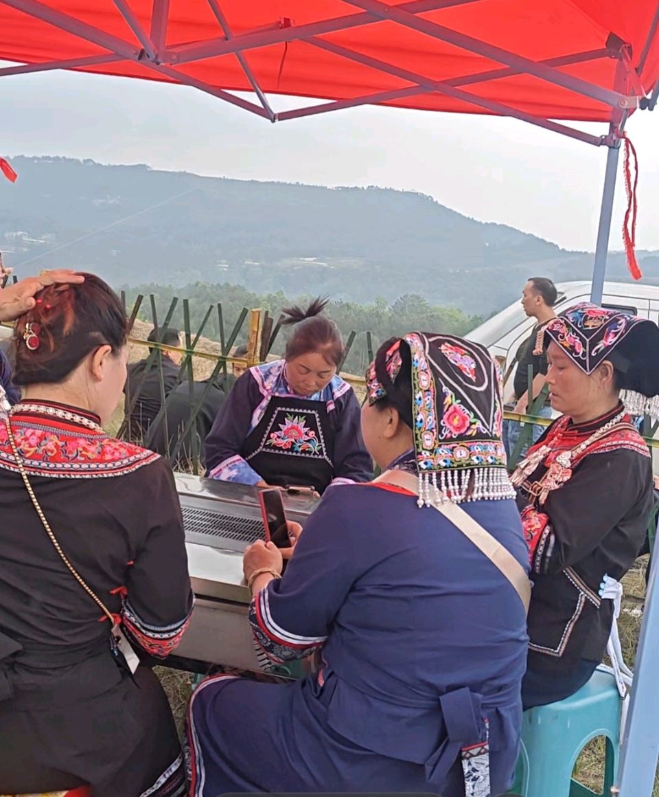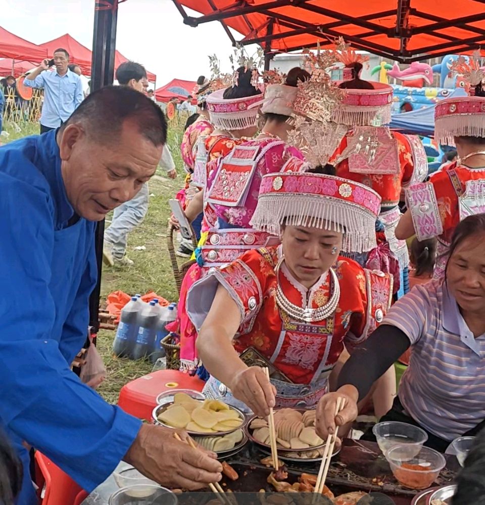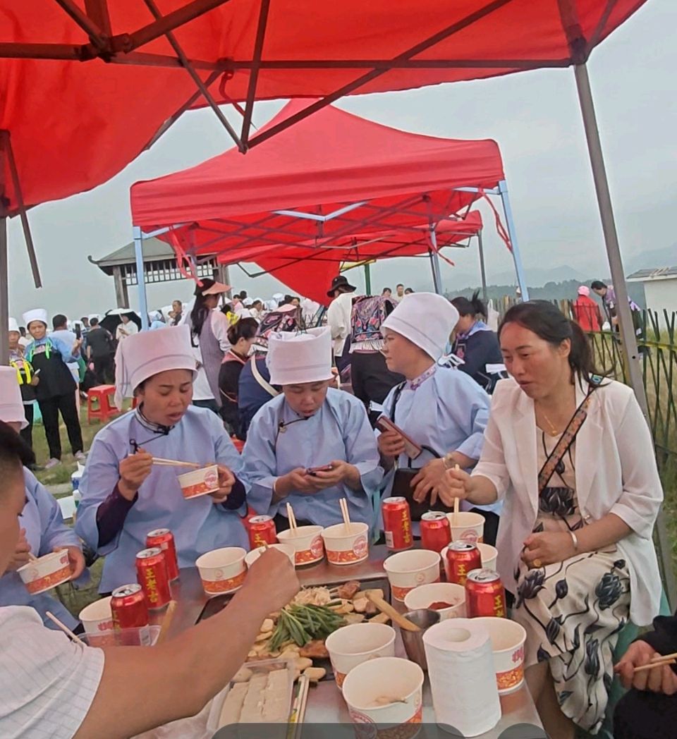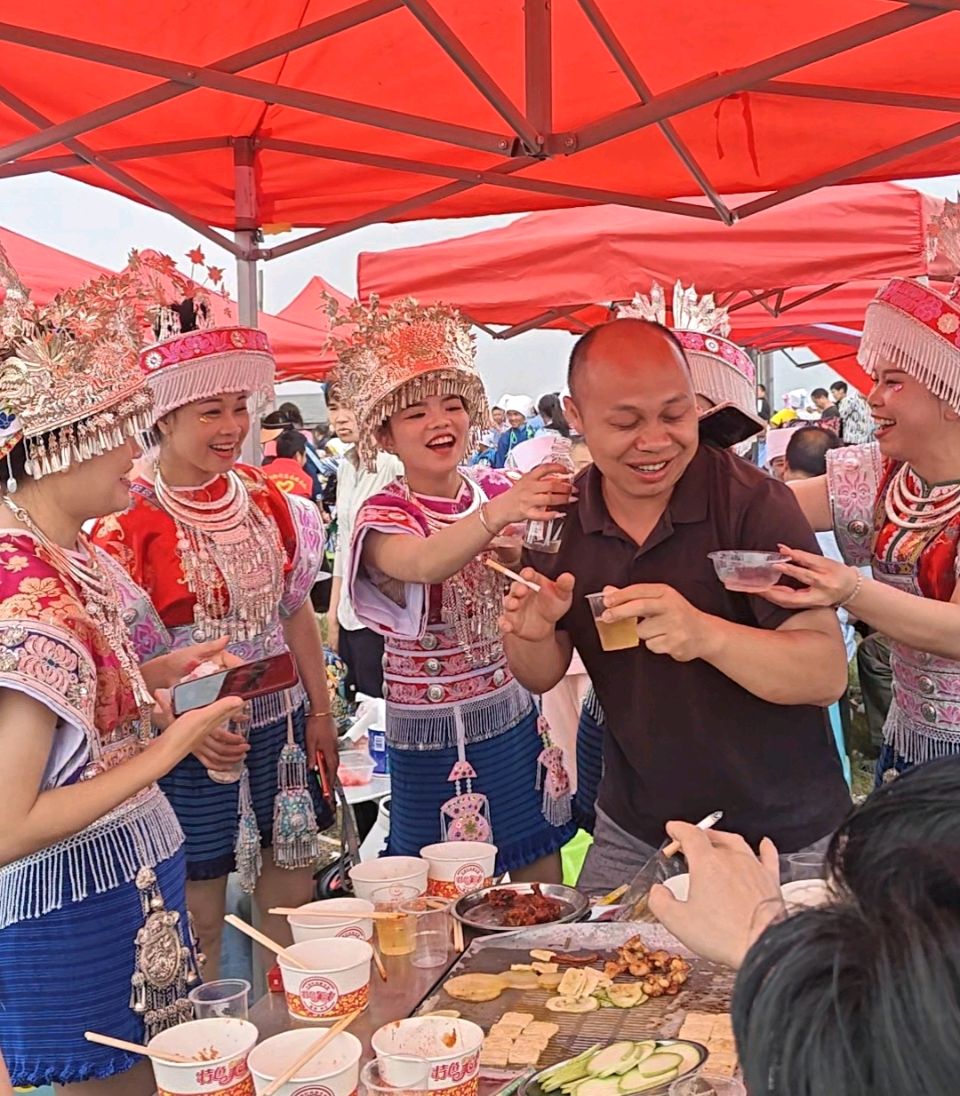 请注意观察吧:在临时搭起的帐篷下,有很多人正在分享美食与烧烤食品的麻辣,请看看这边这一桌吧,美女们正在劝那些帅哥把香甜的米酒品尝品尝一下,体验那“高山流水”的饮酒文化,小伙子吃得多爽快多开心呀!有几个帅哥美女还在划拳打码,谁输谁赢不分上下。