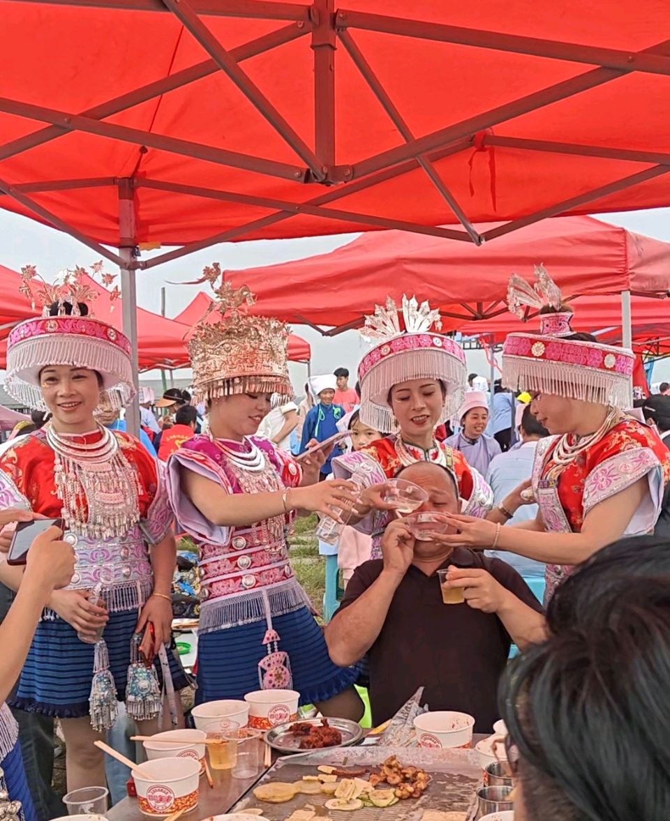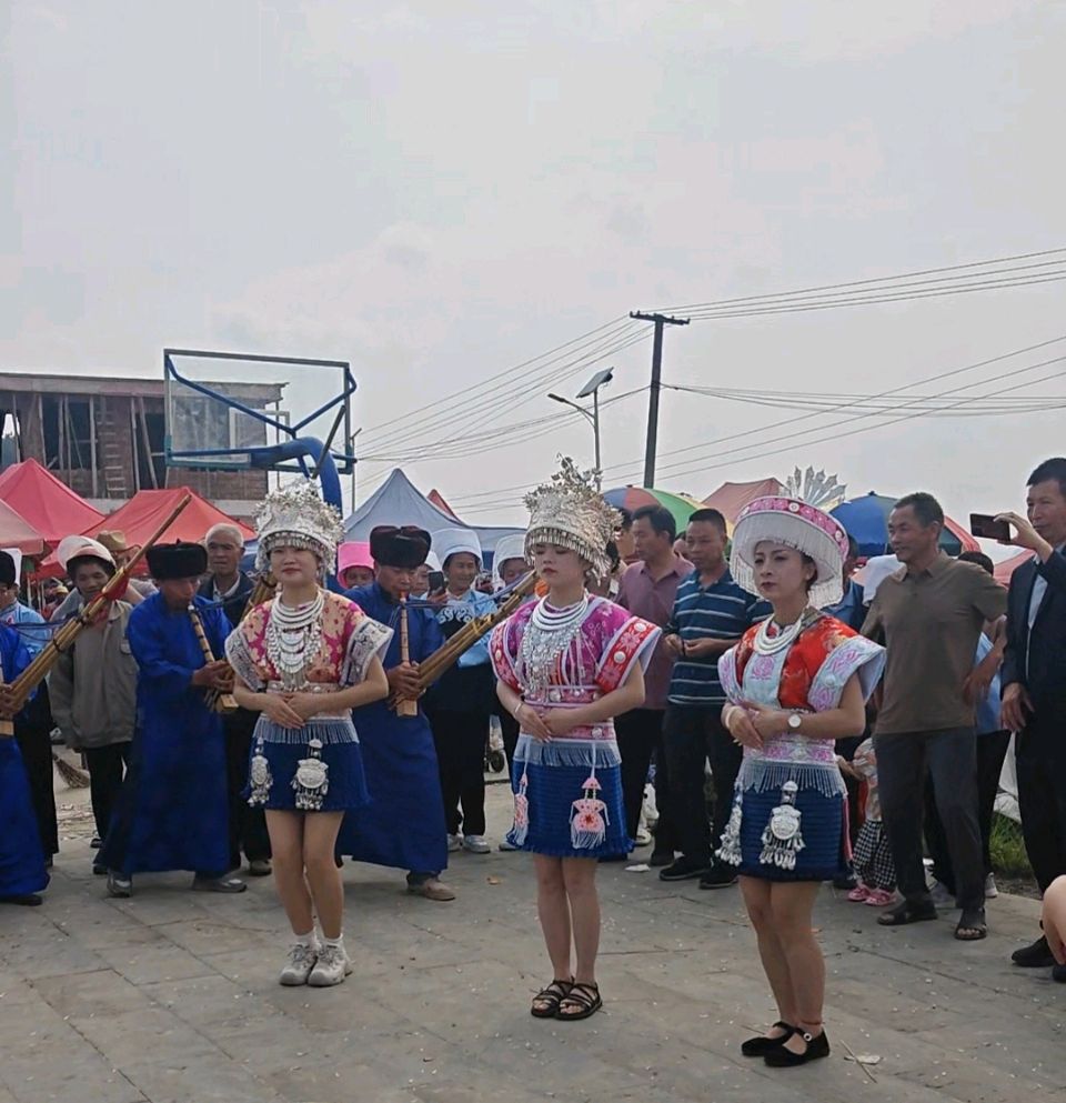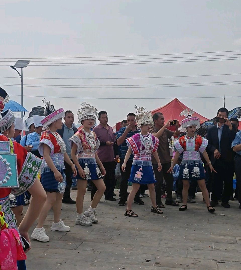 请看看吧:身着盛装的苗家姑娘似飞舞的蝴蝶走过来了,她们头上戴着精致繁复的银冠亮晶晶啊,项戴着银项圈光彩夺目吸引大家,这些苗家姑娘在一个水泥坝上随着乐声跳起芦笙歌舞来啦!那音乐动听舞蹈又优雅,身上的银饰随着轻盈的步伐叮叮当当作响呀,宛如天籁之音宛如童话,吸引了四面八方的人们前来观看了。有的人急忙拿出手机拍照摄影分享给大家,让来不了的朋友们也来感受节日的那种热闹氛围对吗?
