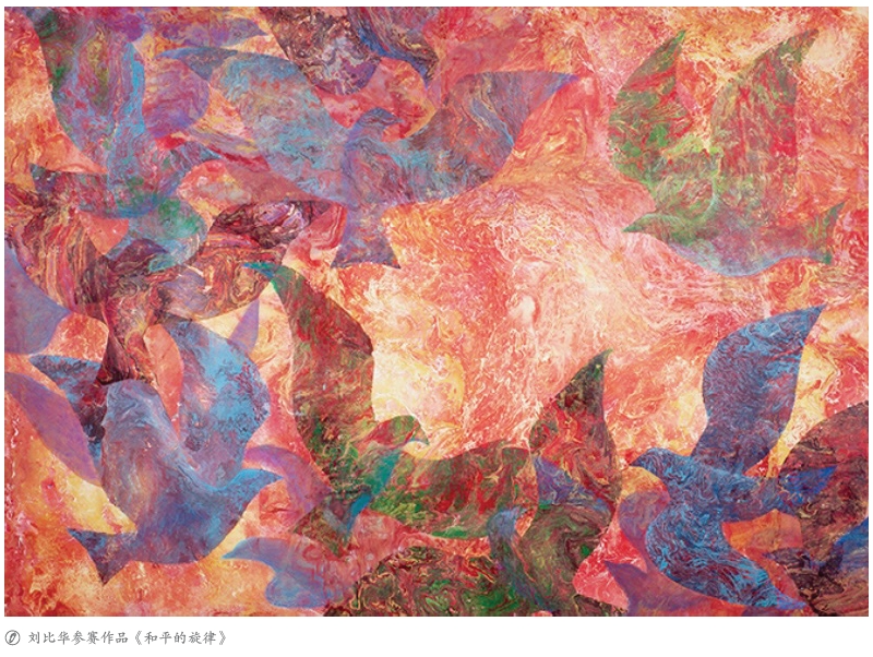 2002年,世界艺术中心与休斯敦大学联合举办了“世界和平艺术大赛”,有34个国家的近万名艺术家参加这次国际艺术大赛。刘比华也精心创作了一幅作品《和平的旋律》参赛。评选时,评委会对这件奇怪的作品争论最多在。这幅作品色彩浓艳,如熊熊燃火布满画面,给人以强烈的压迫感,一群和平鸽在火焰中腾飞,无畏无惧地迎向灿烂的阳光,将人们对美好愿望在压迫中奋进强烈地表现了出来。对作品的技法,评委们不约而同地表示疑惑:这究竟算什么画?是如何画出来的?最后,虽然评委们还是没有完全弄清楚,但这幅画仍以其特殊的艺术魅力和新颖的表现手法,毫无争议地被评为世界和平艺术大赛最高奖项——金奖。