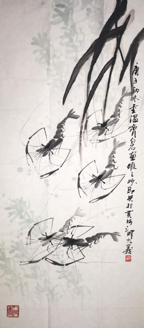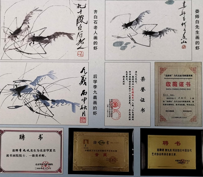 画虾是门特殊艺术,它不仅在中国影响很大,而且在世界艺术之林中也有一席之地,齐自石画虾创造了一个世界奇迹后来他把自己一生的心血传给了他的徒弟类师自先生,娄师自先生又通过办学,把齐自石的绘画艺术传给了他的学生,李九義就是他上世纪八十年代的学生。