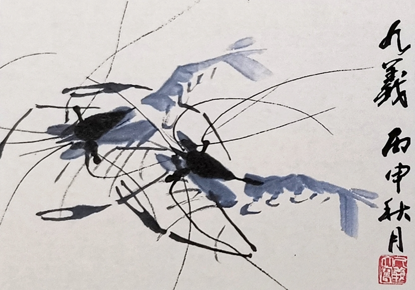 李九义的画,寥寥数笔,墨色浓淡相宜,便将虾的形态勾勒得栩栩如生。虾身的通透、钳子的刚劲、须脚的灵动,都在笔墨间尽显,仿佛下一秒这些虾就会从画中跃入水中。充满了传统中国画的韵味与意境,足见作者深厚的绘画功底与艺术造诣,令人赏心悦目、赞叹不已!