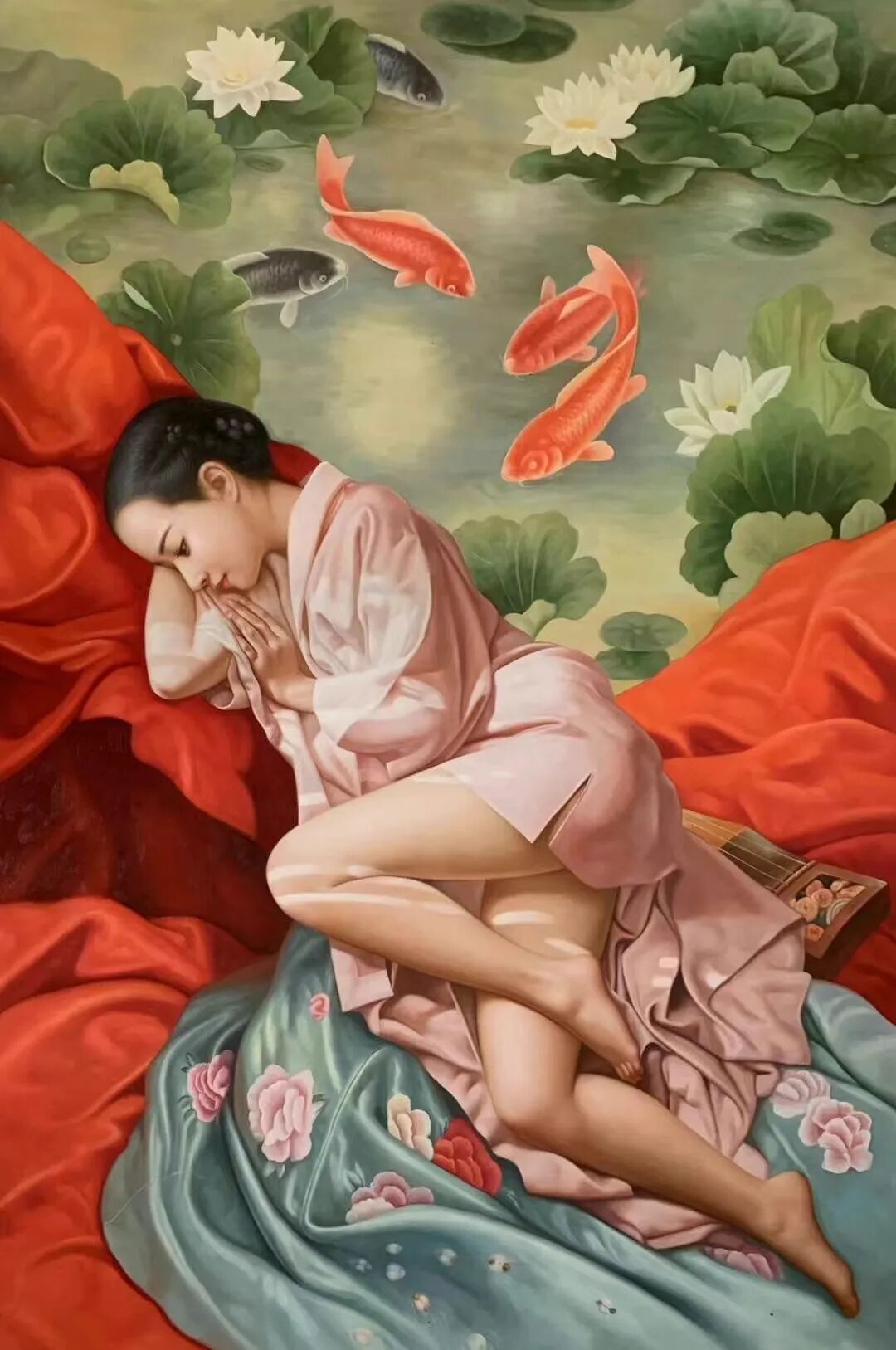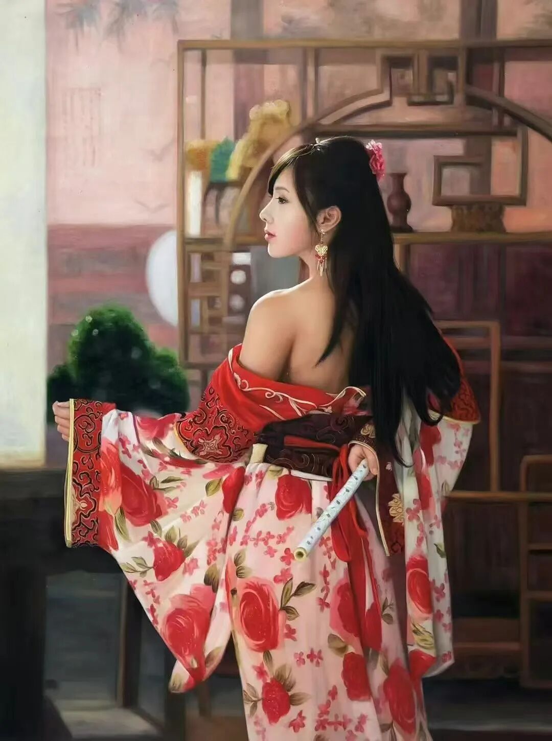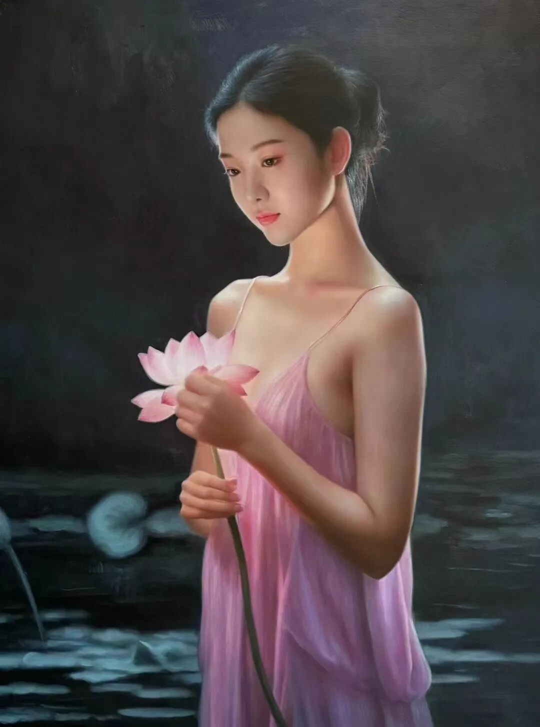 看他的旗袍女子人物系列,画中的美是优雅大方的,颇有一种可远观而不可亵玩焉的纯洁感。而这种形象,显然也是周曦先生有意与时下的物欲横流所形成的对抗。再者一些少女形象,又如邻家女孩一样甜美无邪,肌肤吹弹可破,面容换发光泽,眼神更是极度传神,晶莹出尘,一袭秀发浓密乌黑,在搭配上一套粉嫩裙摆,整幅画面,已是完全不出任何绘画的技法痕迹,取而代之的,则是一种尤在目前的真实感。细腻逼真,但却又是实实在在的绘画功夫,让人难忘,让人感叹!大师水准,正当如是!