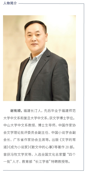 为文学批评“立心”,不仅源自谢有顺对文学本身的热爱,更源于他对人类精神世界的关注。在论及莫言《檀香刑》之后的写作变化,谢有顺没有流于分析叙事结构等表面现象,而是深入文本世界后指出:“感觉象征化后所创造的世界,才是属于莫言独有的世界,就像卡夫卡、福克纳、马尔克斯,都在自己的象征世界里写作。”(《感觉的象征世界——〈檀香刑〉之后的莫言小说》。他讨论徐则臣等作家的形象建构,“徐则臣让自己的声音变得越来越响亮、重要的秘诀,正是他懂得在写作中如何平衡‘我’的感受、扩展‘我’的体验。概括起来说,徐则臣用以平衡和扩大‘我’的感受、体验的三种方式是:写同时代人,‘到世界去’,艺术自律”(《对自我与世界的双重确证——论徐则臣的写作观》)。他警觉文学的轻浅化和欲望化,“文学并不反对轻松和幽默,但任何的写作,都要警惕一种语言打滑的状态,即便是那些以讽刺、诙谐见长的作家、艺术家,最终被人记住的,也肯定是他那颗庄重之心。生活或许正在越来越轻浅化、世俗化、欲望化,随着科技的发展,甚至还将越来越技术化、空心化,但值得文学记录的永远是‘沉重的时刻’,即便身处灵光消逝的年代,文学也不会停止寻找永恒的光芒”(《灵光消逝年代的文学讲述——论张者小说》)。这些论述,饱含谢有顺对文学“活泼泼的生命意识和精神意志”的明确呼唤,这不仅使他的批评有艺术的气质和思想的光芒,还能借着他批评中的锐利眼光,看清纷繁的文学现象后面的真相,并洞察作家创作观念的变迁。