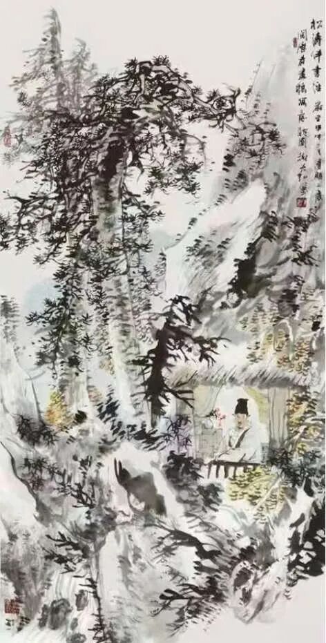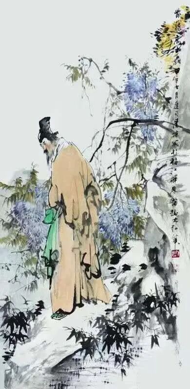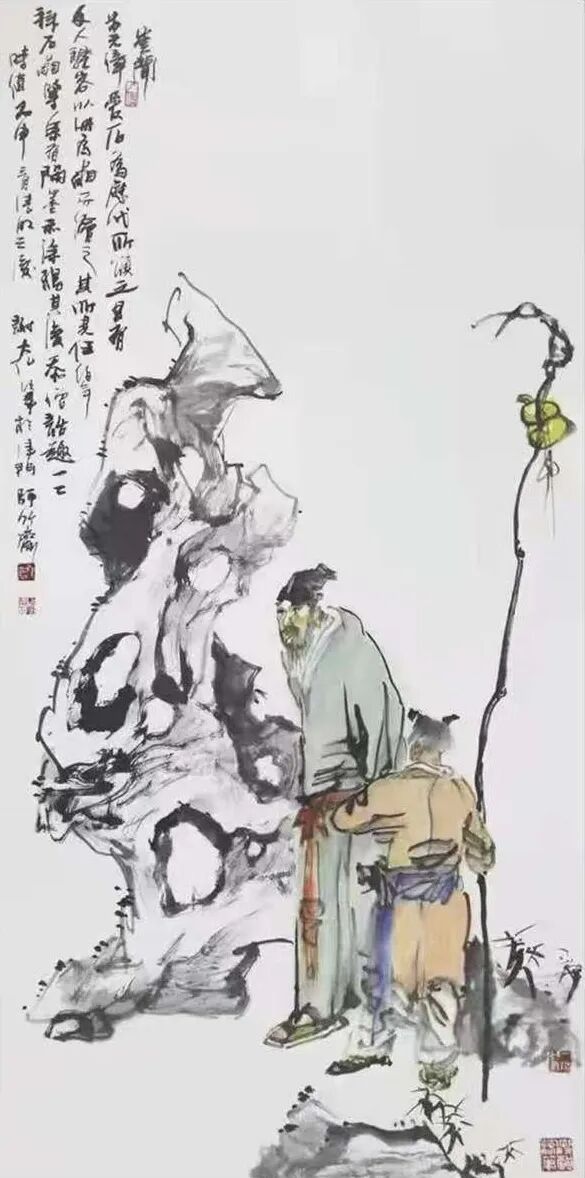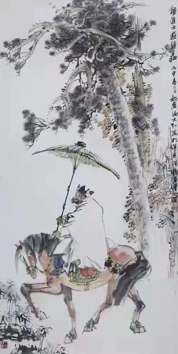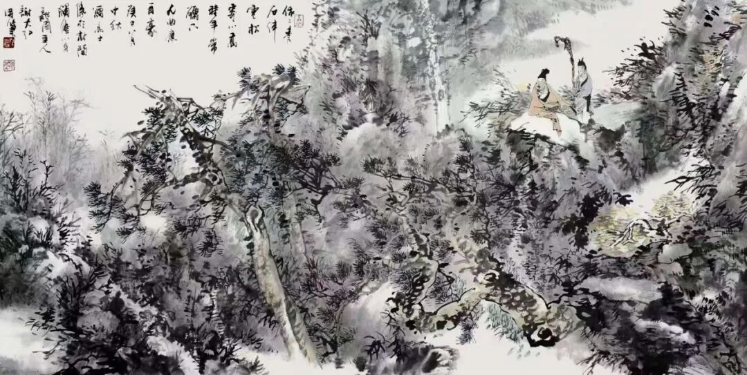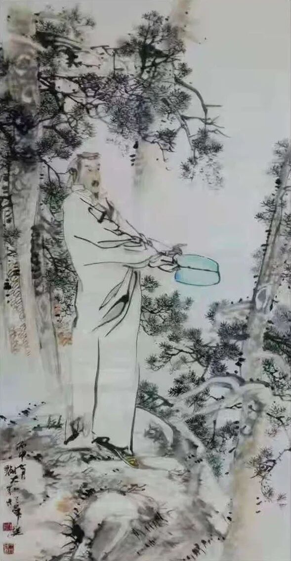 山水画如此,人物画亦然。通过先生写意笔墨的巧妙勾勒,古人雅士的风骨神韵随即就能跃然纸上。而作为观赏者,你既可以从中品味到“自是人间长恨水长东”的深沉慨叹,也是能从中感受到“问余何意栖碧山,笑而不答心自闲”的隐逸心情。潇潇之感,浩浩落落,人物画境虚实相生,写意心境欲说还休,正如这其中的水墨一样,是清疏空灵不染尘俗,足可以直直地沁人心神。