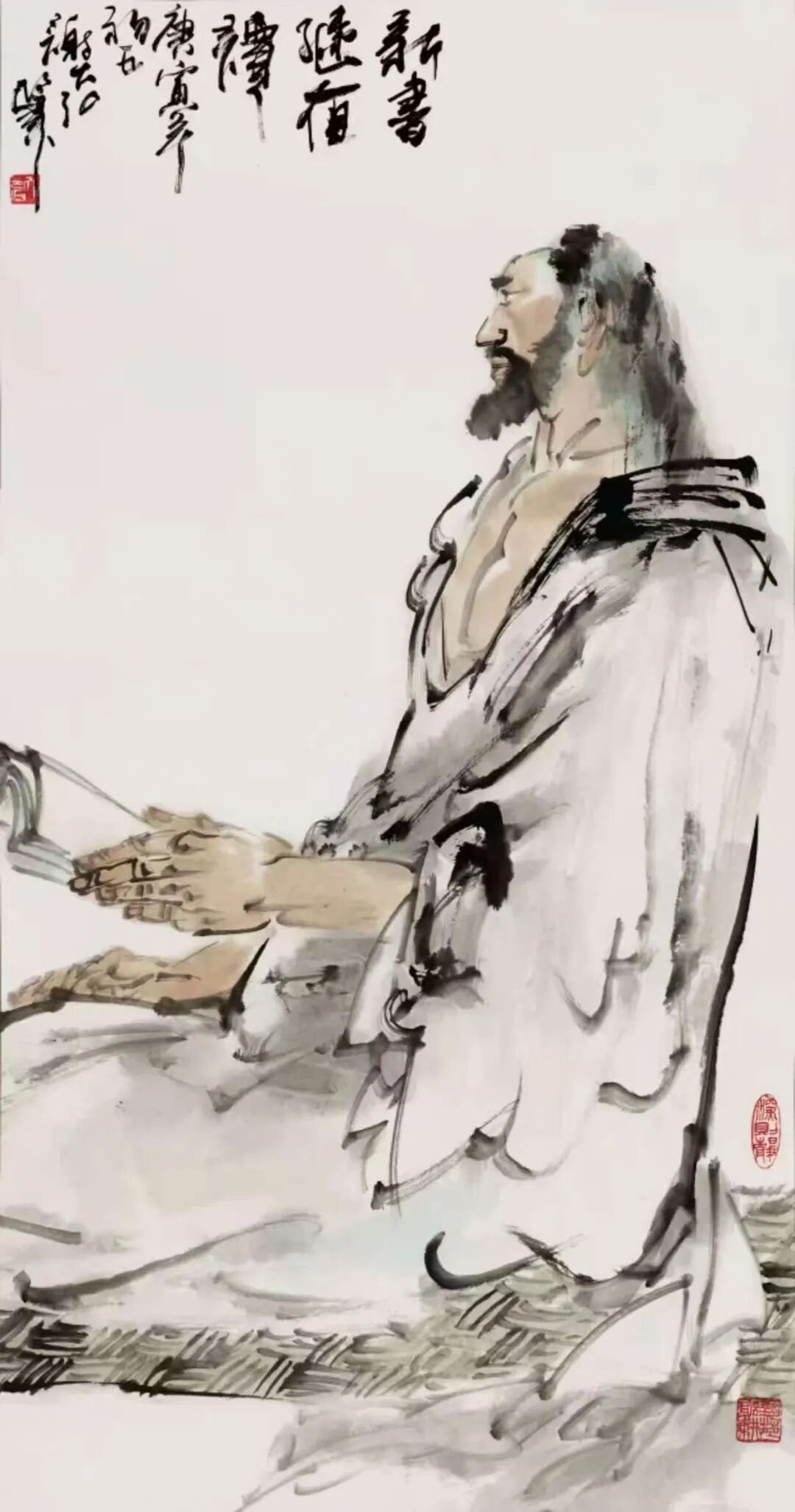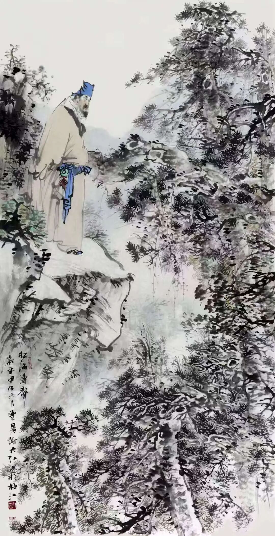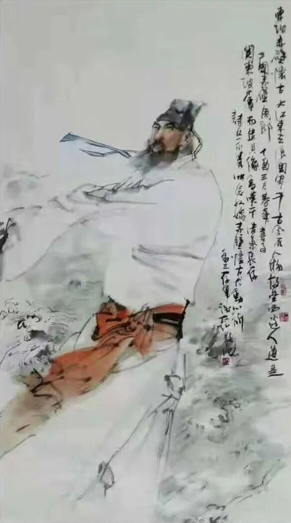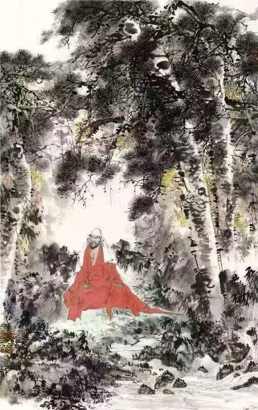 山水画如此,人物画亦然。通过先生写意笔墨的巧妙勾勒,古人雅士的风骨神韵随即就能跃然纸上。而作为观赏者,你既可以从中品味到“自是人间长恨水长东”的深沉慨叹,也是能从中感受到“问余何意栖碧山,笑而不答心自闲”的隐逸心情。潇潇之感,浩浩落落,人物画境虚实相生,写意心境欲说还休,正如这其中的水墨一样,是清疏空灵不染尘俗,足可以直直地沁人心神。