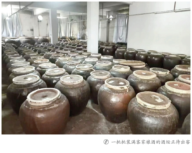 只见门坪庭院上的酒瓮排列有序,一批批酒坛出窖,准备择日生火炙煮娘酒。曹小玲说:“我是土生土长的客家妹,从小在祖母酿造娘酒的环境中长大,家人酿酒我负责烧火,对娘酒有深切的感情。”“男人喝正月,女人喝坐月(生孩子)。我生完孩子后,吃了一个月的娘酒鸡,用了上百斤老酒,出月子时气色很好,此后我对娘酒的感情就更深了,更加佩服客家人千年的智慧,我想把这门手艺好好地传承下去。”
