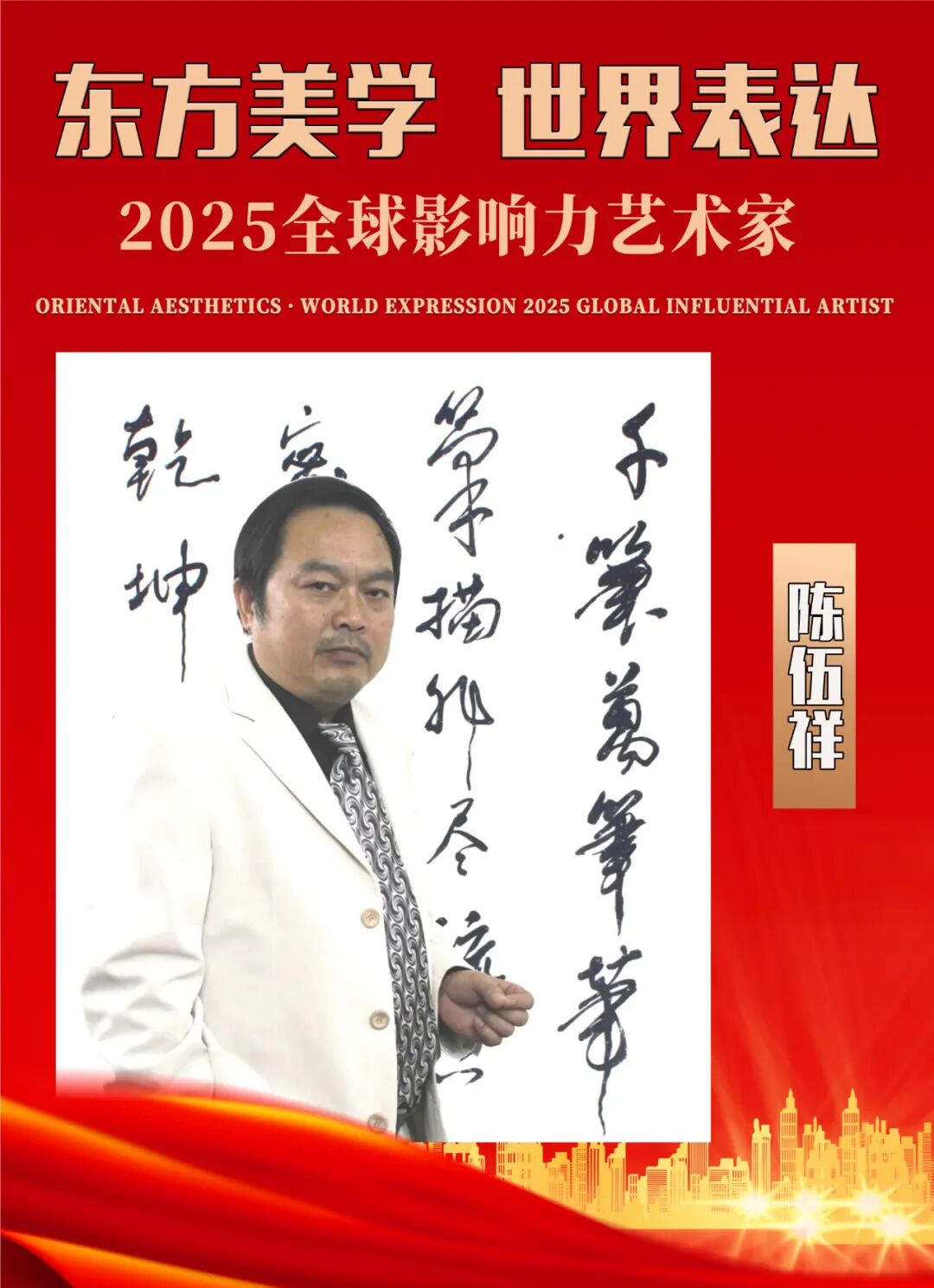 陈伍祥(名主溪水人,号八愚轩主人)1957年出生于湖南永州。国家一级美术师、全国名人书画艺术界委员会委员,中央国家机关书法家协会会员。中国东方文化研究会美术研究员等。1979年工作至今一直从事书画艺术的教学。90年前后开始国画创作,96年创办怀素书画院。在本地施行书画艺术的推广教育。1,2000年本人组织执教的美术课‘基本形体切挖’参加全市中小学录像课大比武获一等奖。且代表本地区参加第11届中南六省(区)中小学美术教育协作交流会。 2, 2005年8月参加在北京大学举行首期全国书法高师资论坛且获得北京市教育考试指导中心与北京大学书画协会颁发书法高级师资研修结业证。3, 2006年11月 参加在中国人民大学徐悲鸿艺术学院举行第二期全国书法教育推广及表彰大会。二,历年来本人一直采用国画艺术手段表现富有时代气势的城市变迁图---永州。这是一座历史名城,座落在江南的潇湘河畔源河两岸,景色非常优美。如此它也经历了三个时期的突岀变化,如此称谓“永州潇湘三步曲系列”。三步曲分别为《永州河西大观图》长6米、宽40厘米,表现改革开放初期。《锦绣潇湘》长16米、宽40厘米,表现解放初期。《潇湘宏图》描绘现今时期,其城市变化巨大,目前巳描绘了10米多、才完成三分之一段,这是我毕生所投入的,用传统绘画艺术说话,因此所创作的也都是长卷等。1,2009年8月入编《中华名人格言》130页<中国文史出版社>。2,2010年入编[新中国人民美术家]201页 (中国国际文化出版社)。3、2011年入编<<1921年至2011年—建党九十周年特集>>71页 (河北美术出版社)4、2012年入编《全国百家书美影画集》封面人物、封二、封三、封底、17页、(中国文化艺术出版社)。入编品读中国传统文化系列丛书之一《当代艺术名家》3页<中国华夏艺术出版社>。5 、2013年入编《新中国书画八大家糸列丛书》共八冊(中国书画艺术出版社 )。6、2014年入选中国文化第027期《国家文化传承人物》专辑 (中国国际艺术出版社),和《新中国美术编年史〔1949---2014〕(北京工艺美术出版社)等.7,2015年入选《中国学院派艺术家三十人》作品集32页,<北京工艺美术出版>。 8,2016入选《中国一线艺术家》(中华国礼出版社),入编《百年经典》15页<黑龙江美术出版社。9月入选《中国国际新闻》杂志刋,〈中华艺术家〉新闻人物,63页。9,2017年入编《书法与美术》教材名作赏析146至150页丶<首都师范大学出版社>。1、1998年论文<书画训练速成初探>入编《三湘教师优秀论文选》149页(新华出版社)。2、1999年论文〈素描训练速成法初探>入编《湖南教师优秀论文汇编》下冊146页(中国广播电视出版)。3、1999年论文《現代工艺型壁画的制作尝试》在全省教师教研教改优秀论文评比中获贰 等奖且于2000年入编《中国书画基础教学论文选集》(第二辑)198页(香港现代美术出版社)。4、2001年论文《国画教学方法的尝试》获中国素质教育研究与发展创新成就一等奖且入编《中国教育改革探索》102页(中国人口出版社)。5、2005年论文《书画训练新法》获国际优秀论文奖,等。 1、2007年选入《二十一世纪中国代表书画家系列邮政明信片》创作水墨山水画长卷《潇水图》长10米入编《中华杰出书画家精品专辑》。 2、2009年授予“共和国六十年建设成就邮票人物”和“共和国建设者”奖章。11月被授予.共和国百业英才人物金奖,暨共和国十大英才人物候选人,业绩入编[红旗颂]共和国百业英才人物大典一书,20页。<中华名人传记出版>。3,2011年入选《国史人物大辞典》285页<中国新闻出版社>。4,2012年入选‘2012年年度塝样人物专题明信片’,及其入编2012年《全国社团优秀领导人大辞典》76页。5、2013,年荣获‘国家一级美术师’且入围‘国家一级美术师网’。6、2014年入选入编〈国家文化传承人物系列专辑〉与‘中国美术编年史(1949—2014)。及其《中国楹联家大辞典》《中华名言词典》。7、2015年授予‘学院派艺术家’。及其业绩也入编大型纪实文集《中国旗帜人物》任名誉主编,11月入选《人民美术报》纪念抗日战争暨世界反法西斯胜利70周(1949--2015﹞70年70家专刋。8、2016年入选《向人民汇报》---当代艺术大家四人典藏册和《美丽中国》百家媒体重点推荐的著名书画家,9月入编《中国国际新闻》杂志63页<中华艺术家>新闻人物。12月被邀做客参加CCTV央视《艺苑相约》访谈。入编《中国旗帜人物》34页<中国科学文化出版社>。9、2017年献礼全国两会“人民形象优秀书画家”全国几十家各大媒体重点报导。且被中国国学学会、中华国礼出版社评为“中国六大艺术泰斗”之一。10、2018年入编魅力中国闪耀世界《世界邮票上的中国艺术》。11、2019年7月国画作《锦绣河山》被中国国家博物馆收藏,13、2021年1月获当代艺坛杰人物献礼建党100周年专题展.14、2022年巜环球人物》杂志〈时代巨匠为人民创作〉重点报导。15、2023年3月被聘为CCTV高清传统艺术栏目组、CCTV我要上央视艺术展栏目组客座教授。16、2023年5月被评为全国非物质文化遗产传承人。17、 2023年11月被评为“全球百强榜艺术家”。18,2024年3月被CCTV艺术栏目组授予〈中国书画艺术培训基地〉。19,2024年4月入编国家正规出版物《办公室业务》杂志-《时代风华》当代艺坛名家研究范例-美术文献。——记著名书画家陈伍祥