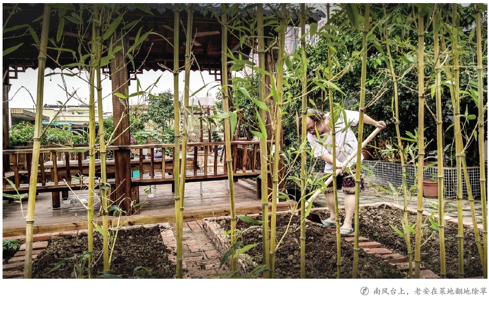 老安在《种菜记》中写道:“今后我只需要两种种植,一种是文字,一种是植物,在经历过众多的徒劳和消耗之后,这两样是我所能维持的最后的劳动,它们同样需要运用身体和心灵。”人的一生更多的是践诺——在往后的日子,老安更是安于弄草侍花,著书写墨,相继出版了《开篇岭南》《在每一座城市短暂驻留》等五六本书籍,以文字滋养着这一片小天地,与俗事相抗。平日里,老安也不让自己的写作空余闲着,在他断断续续的锄耕下,南风台有了自产的食物——菜地里竞相生长的各种蔬菜。蔬菜与厨房有天生的关联,它的收成使厨房的使用率得到很大提升。游坚是南风台首席大厨,一二十人享用的菜肴在他手中变换着花式,手中的锅铲像一根魔术棒,在双手抖动之间,餐桌上就摆满了色香味俱佳的菜肴。当然,这也离不开调料师世宾的异想天开,他可以随手摘下紫苏、薄荷、黄皮叶子等,做出一碟精美佐料。记得评论家白岚就曾说过,世宾调制的味牒,足以让她整顿饭不再需要菜肴。摄影师的身份与厨师的身份在游坚身上得到高效融合,女诗人喜欢在南风台拍照,而拍照又离不开游坚的镜头,因而会经常见到游坚在厨房与天台之间忙碌,直到有一次他因拍照而把菜烧焦之后,才让他在做菜时收起了镜头。饭后的餐具洗涮,也有一个不成文规定,那就是初次登台者优先,其次之才是志愿者或被点名者——此规定没有引起过任何争议——我们都是入乡随俗者,从日常去欣赏彼此,接纳对方。