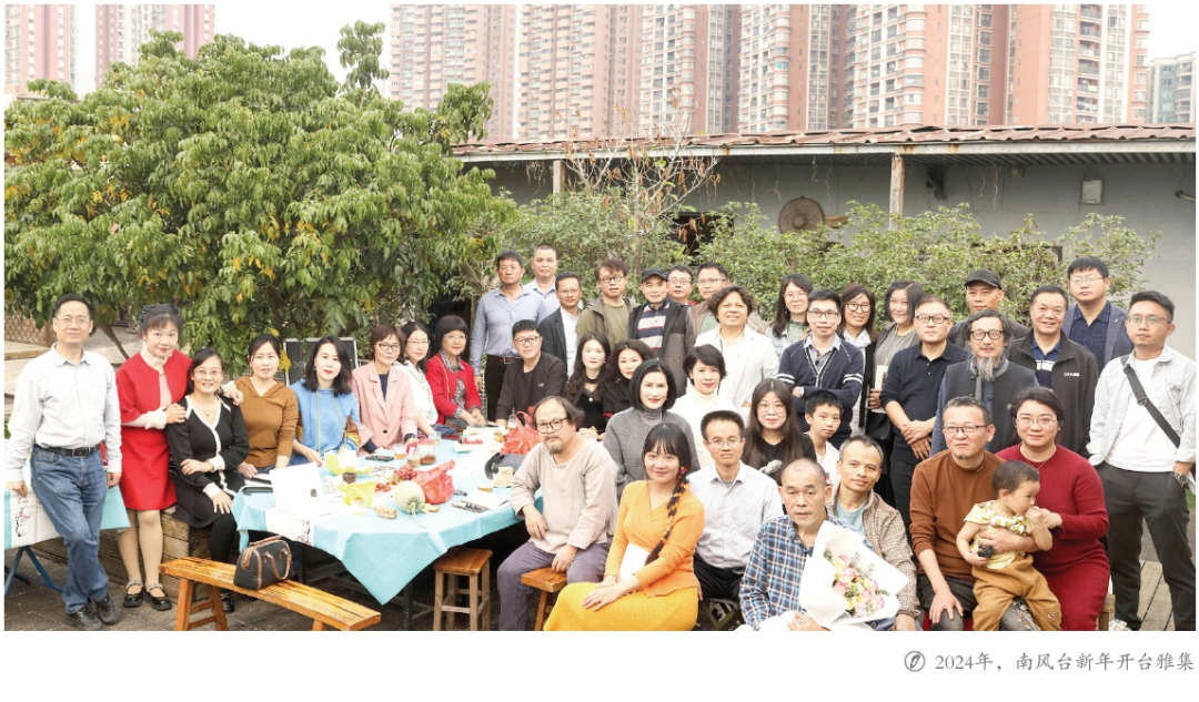 凉亭里的长桌对南风台的热闹作出过多次见证。在这个天台上,朋友相聚是常有之事。不同的相聚又可分为小聚、中聚、大聚,通常10多位朋友相约在此吃饭喝酒为小聚,二三十人的时候为中聚,四五十人时就称之为大聚了。当然小聚最是常见,朋友们一边谈着琐碎之事,一边享用游坚用精湛厨艺带来的美食。中聚与大聚基本上与文学有关,常举办一些诸如作品分享会等庆祝活动,有时也会举办一些文学讲座。例如举办中山大学几位学者创建的见言读书会、广佛诗人把脉南海诗歌走向、梦亦非诗歌讲座、安石榴长篇历史散文《开篇岭南》首发、夏阳散文集《李白来到旧金山》作品研讨、游坚摄影集《江边公园》发布、贺贺散文集《青虫》分享及本人长诗《狩疫记》研讨等各类文学沙龙。而一年一度的南风台新春雅集与周年台庆,更像是一个文人集市,互相交换富含价值的高价思想。这些活动莅临者众,艾云、魏微、朱燕玲、张鸿、黄金明、冯娜、杜绿绿、阮雪芳、洪永争、聂小雨、陈会玲、嘉励、温志峰、阿翔、程峰、汪治华、杨勇、吴作歆、陈才文、林丽筠、盛祥兰、杨莲、陈丹、汪能平、沙乐美、仲思等及许多未及署名的诗人作家都是常客,带来友谊与文学的深谈。当然此类活动的主持离不开被称为诗歌“独唱演员”的黄礼孩。在主持中,他对文学的独特见解释放着被许多人所见的彩虹般的斑斓——这些文学记忆,南风台没有作更多的记录,但有一本泛黄的留言簿收藏着这处文学秘境发出来的思想光芒。在2017年度的东荡子诗歌奖评奖活动中,评委蓝蓝、张桃洲、世宾、黄礼孩、龙扬志等5位评委登台评奖后在本子上写过留言。蓝蓝写道:北邙山下捕梦网,南风台上捉韵人;张桃洲写道:南风台,新的诗歌秘境;世宾写道:这里有风有景,有情有诗;黄礼孩写道:南风盛开辽阔的世界……后来多次应邀莅临的小说家鲍十写道:在南风台坐享南风拂面,思游八极,上天入地,自之在之。散文家陈善壎老前辈也写道:朋友常来的地方就是好地方。还有活在朋友们心中的诗人、评论家温远辉则写道:南风台大实……诸多留言写满了半本册子,这里不一一列举,友谊与感恩存于心底更觉醇香。如今南风台俨然成为广佛文人的唱酬之地,往来的文友彼此以朋友的身份把酒言欢,甚至借夜色刻意隐藏各自的文人身份。我们知道,文人的身份在庸人面前是如此不堪一击,但我们都会引以为豪,以孤傲的灵魂作出对文学的献祭与舐犊。